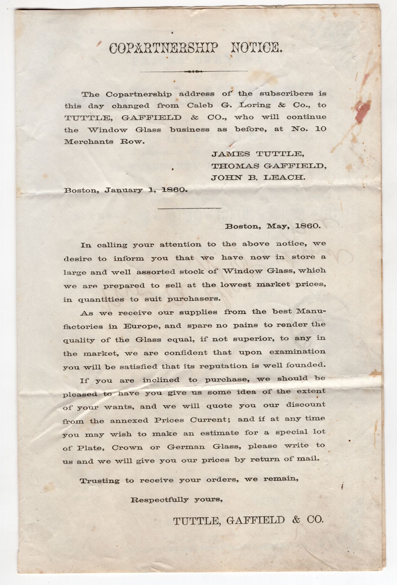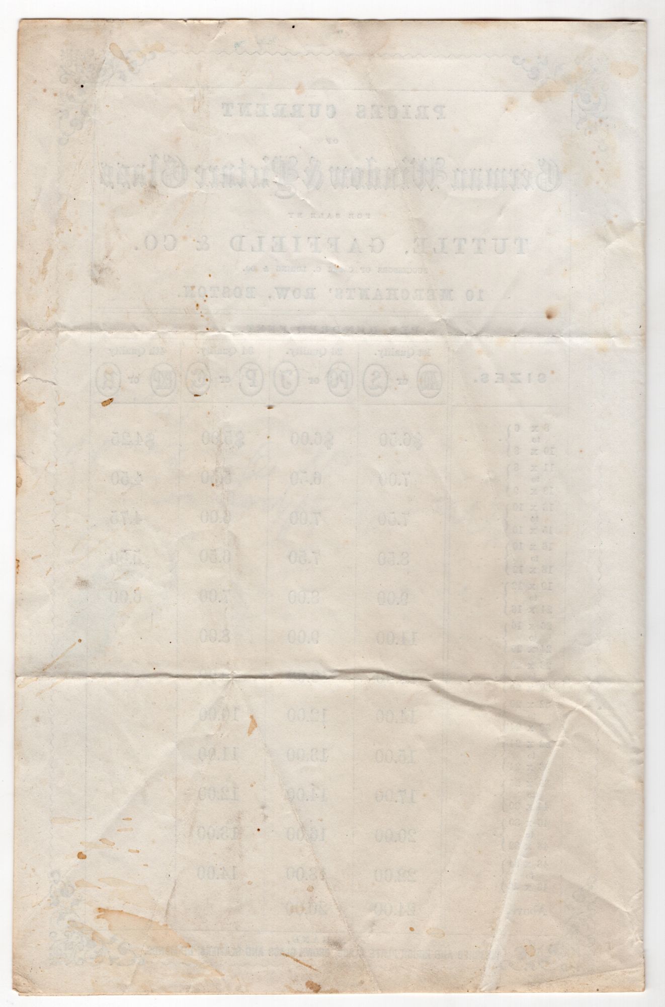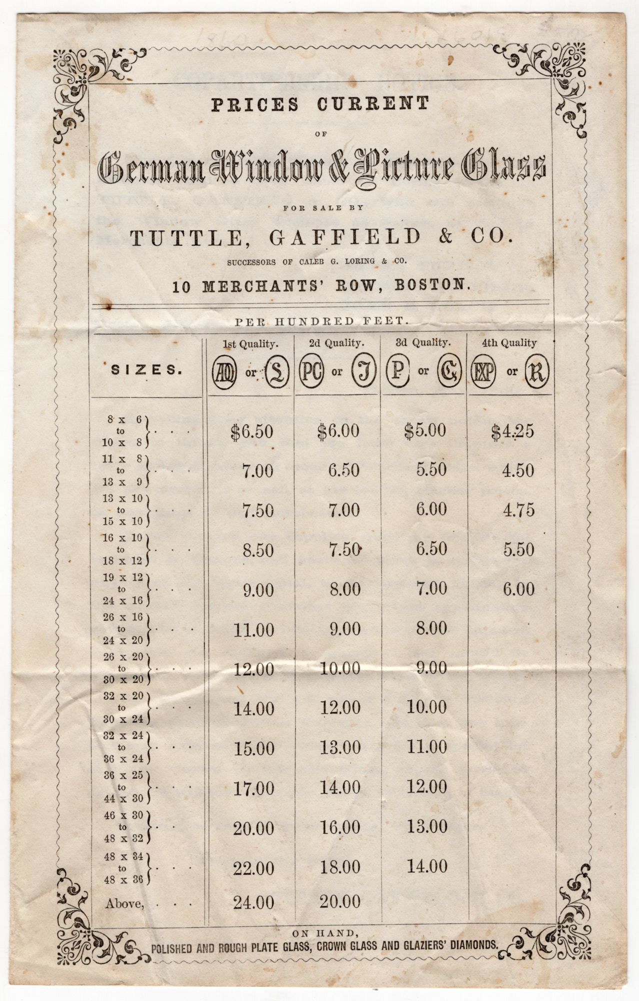 Boston, Massachusetts: Tuttle, Gaffield & Co, 1860. Very good. Some spotting, letter folds, dust soiling.. Printed price list of German window and picture glass for sale by Tuttle, Gaffield & Co. of Boston. Each type of glass is graded by quality and sorted by size, with prices for each. Notes the sale also of rough plate glass, crown glass and glazier's diamonds. Contains a more detailed pitch to customers inside, noting its use of only the finest glass from European manufacturers. Previously letter folded with ink manuscript address and postmark. Printed bifolium measuring approx. 8.25" by 5.5