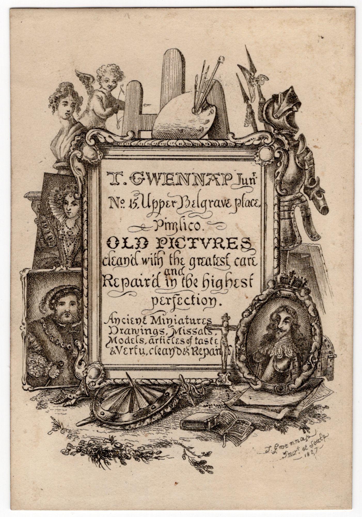 Pimlico, London, England: T. Gwennap Junr, 1827. Near-fine.. A scarce engraved business card advertising conservation services by an engraver and art restorer in London: "T. Gwennap Junr. No. 15 Upper Belgrave place Pimlico. Old Pictures clean'd with the greatest care and Repaired in the highest perfection. Ancient Miniatures, Drawings, Missals, Models, articles of taste & Vertu, clean'd & Repaired." The image depicts the text surrounded by an elaborate frame, various objets d'art, and 17th century paintings (including one of Henry VIII). Measures approx. 4.75" by 3.25" Several engravings and etchings by T. Gwennap survive, but it is rare to find evidence of the engraver's other professional activities (i.e. art conservation).