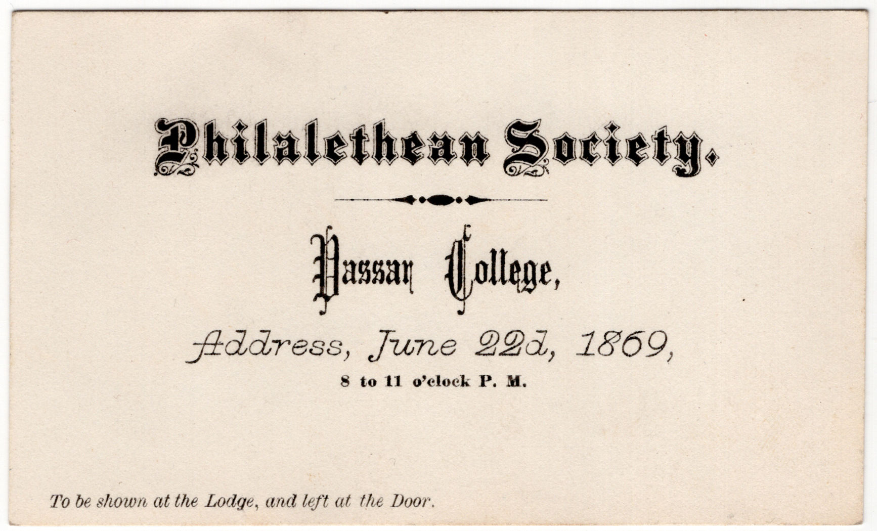 Poughkeepsie, New York: Philalethean Society, Vassar College, 1869. Near-fine.. Lithographed invitation to a meeting of the Philalethean Society at Vassar College, to be held on June 22nd, 1869. The Society, also referred to as The Philaletheis Society, is a student theater group founded in 1865 as a literary society. Measures approx. 2.5" by 4.25