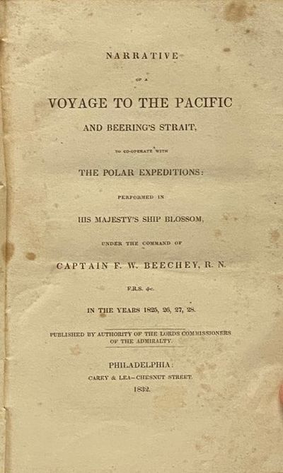 Philadelphia: Carey & Lea, 1832. First American Edition. Hard Cover. Good/No Jacket. First American edition. Boards rubbed with some loss from spine label and light spots to boards, foxed throughout, Oxford bookstore bookplate on front endpaper. 1832 Hard Cover. xi, 493 pp. 8vo. 24-page publisher catalog bound in following text. Originally published in two volumes in England in 1831, this first appearance in the U.S. excluded the plates, maps, and appendices present in those versions, and diminished the type size, allowing the remaining content to fit in one volume. The main text is unabridged, and some footnotes are added. Sabin 4347: "Captain Beechey and Sir John Franklin had arrived within fifty leagues of each other, when the latter was compelled by the weather to return. One of the most valuable of modern voyages, containing a most interesting visit to Pitcairn's Island, the coast of California, etc." Howes B-309: "Interesting accounts of Monterey and San Francisco before the American conquest." Arctic Bibliography 1229: "Another edition without plates, maps or scientific appendices, but with main text reprinted in smaller type and a few new footnotes.