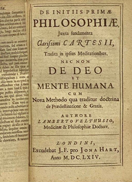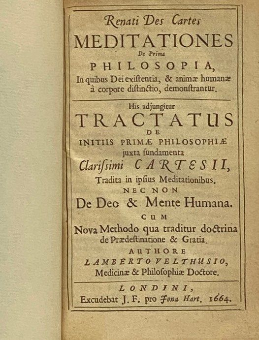 London: Excudebat J.F. [James Flesher] pro Jona Hart, 1664. First Thus. Hard Cover. Near Fine/No Jacket. Rebound with new end sheets: brown leather spine, marbled paper over boards, red morocco spine label, gilt titles and rules. Binding tight, pages clean and unmarked. 1664 Hard Cover. [viii], 230 pp. Last text page misnumbered 216. Descartes's fundamental and originating work of the modern era in Western philosophy, bound together with a work by one of the Utrecht Cartesians, Lambert van Velthuysen. This is the first British printing of the Meditations, though it does not include Descartes's 'Objections and Replies' as many editions do. Velthuysen was connected by marriage to Descartes's friend Henry Regnier, and corresponded with scientists and philosophers such as von Leeuenhoek, Spinoza, and Leibniz. The work included here shows the influence of Thomas Hobbes - unsurprising, given that Velthuysen is credited with translating Leviathan into Dutch. John Locke may have met Velthuysen while in Utrecht in 1684/85, and had eight titles by Velthuysen in his personal library, including the Rheims edition of the present title. Bound into this volume are two plates not called for in either work, which may be taken from the Hart printing of Principia Philosophia, which was published the same year. Wolf 736, Wing D1133a.