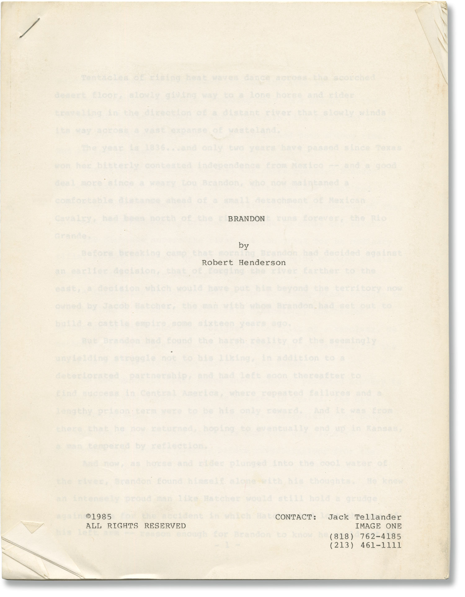 White titled self wrappers, with title page integral with the front wrapper as issued, dated 1985, with credits for screenwriter Robert Henderson. 16 leaves, with last page of text numbered 15. Xerographic duplication, rectos only. Pages Very Good plus overall, partially bound with one staple.