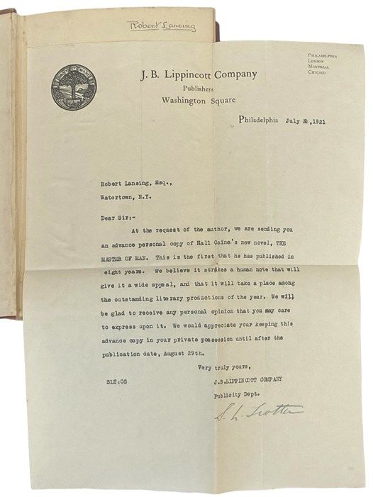 Philadelphia: J.B. Lippincott Company, 1921. First American Edition. Hard Cover. Good/No Jacket. 0x0x0. First American edition. Advance presentation copy with TLS to U.S. Secretary of State Robert Lansing (this volume was purchased from a family library in Henderson Harbor, NY, near his birthplace in Watertown, which included many other works owned by him). Lacks jacket. Spine faded, edges a bit foxed. 1921 Hard Cover. 430, xii pp. Dark red cloth, black titles. Caine's penultimate novel, dealing with sin (primarily adultery and infanticide), justice and atonement.