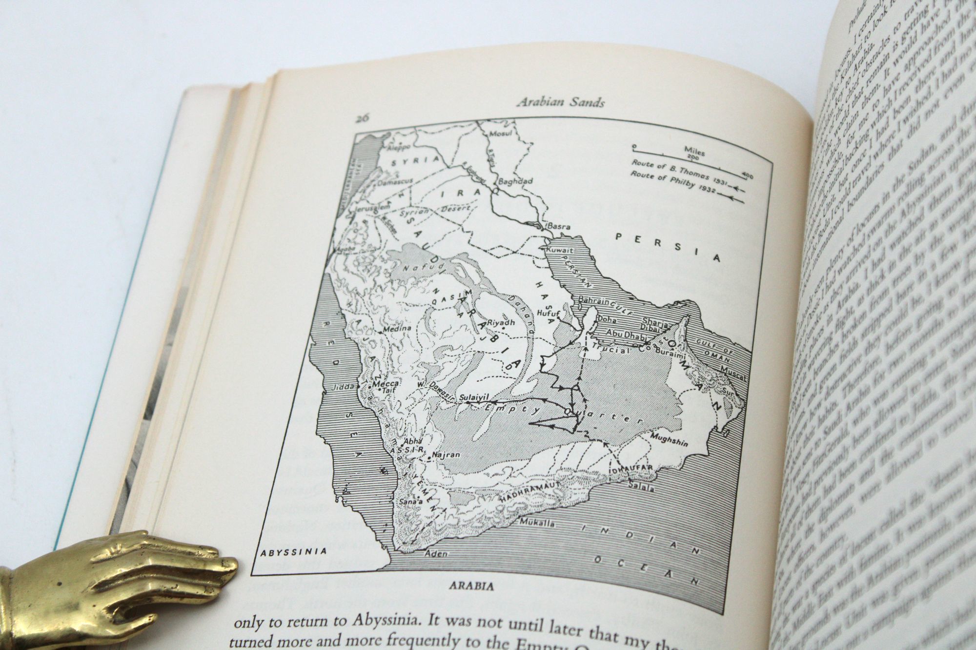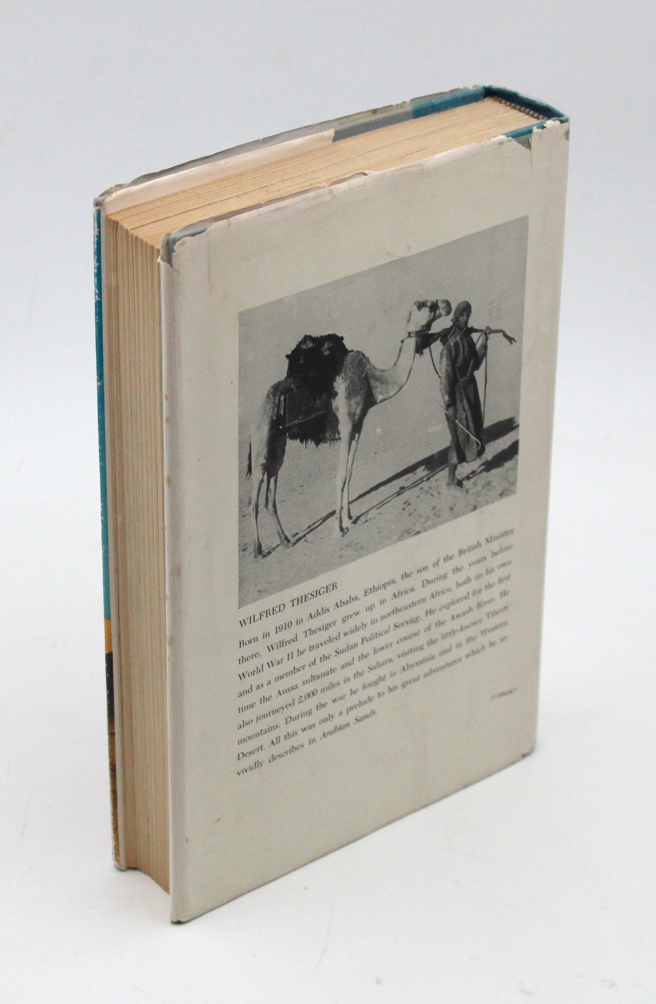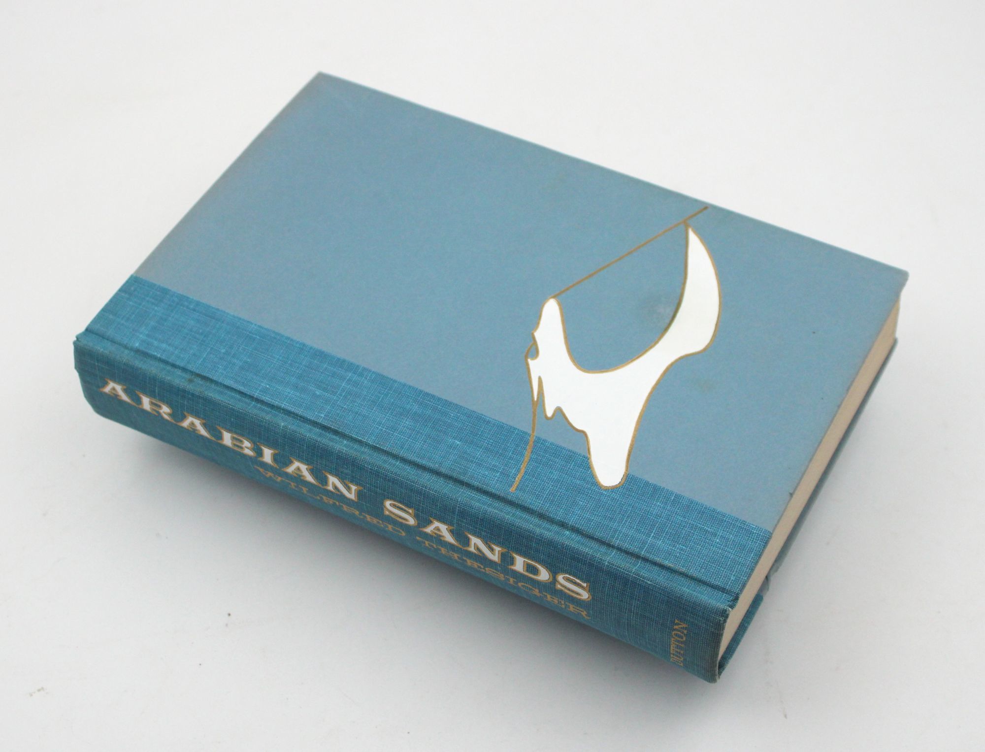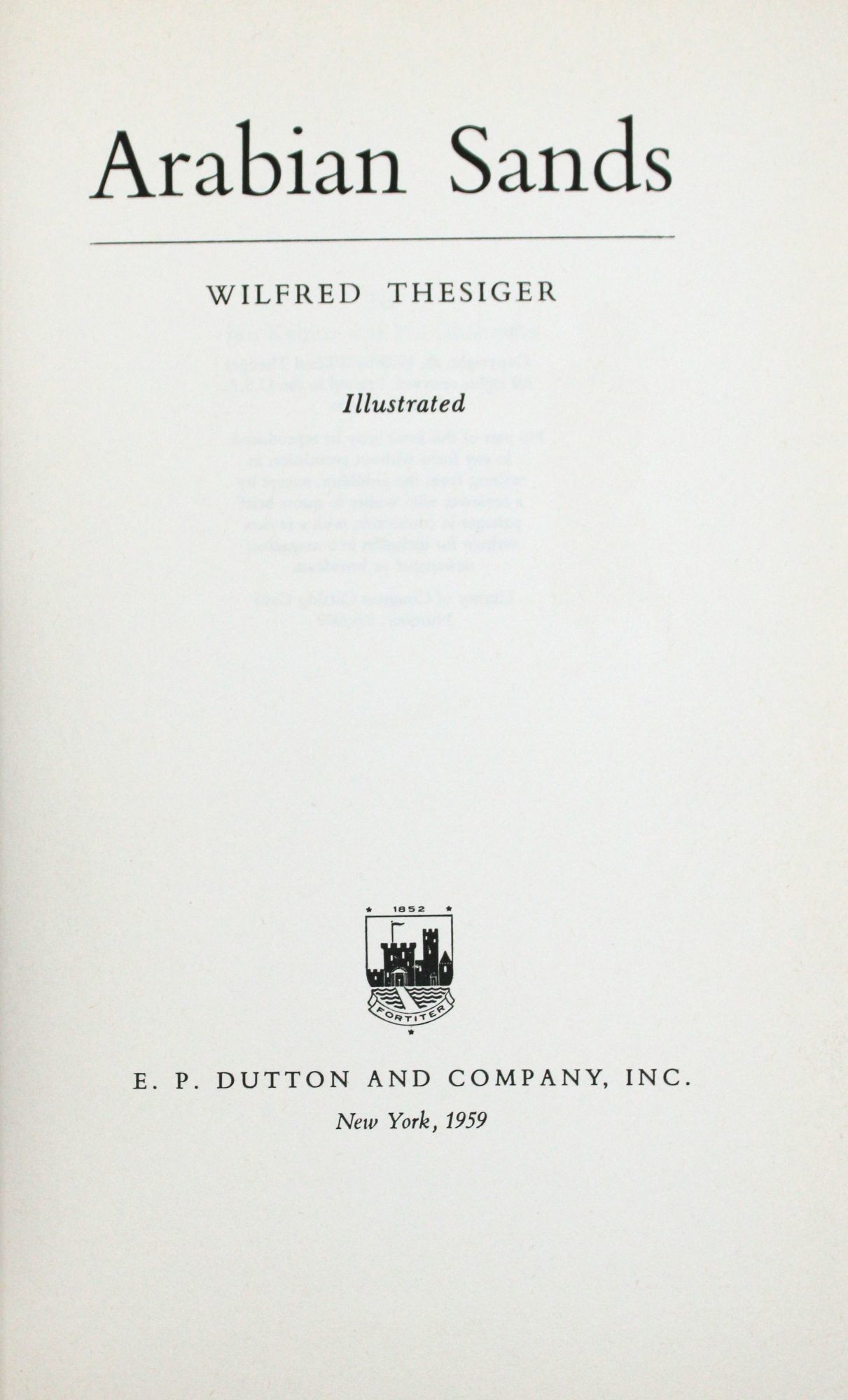 New York: E.P. Dutton and Company, Inc, 1959. First American edition. Illustrated with black-and-white photographs and maps, with one fold-out map affixed to rear pastedown endpaper. xvi, 326 pp. 1 vols. 8vo. Quarter bound blue cloth and paper boards, stamped in gilt and white on front and spine, photographic color dust jacket with some shelf wear to edges and corners. First American edition. Illustrated with black-and-white photographs and maps, with one fold-out map affixed to rear pastedown endpaper. xvi, 326 pp. 1 vols. 8vo. Arabian Sands is Thesiger's first and most important work, recounting his dual crossings of the Empty Quarter, the first under the aegis of the Middle East Anti-Locust Unit in 1946-7. Although brief reports of the journey were published in the Journal of the Royal Geographical Society in the late 1940s, it was only through the efforts of his friend Graham Watson and the publisher Mark Longman that Thesiger was persuaded to write a book-length account. This is the First American edition, published in the same year as the British first.