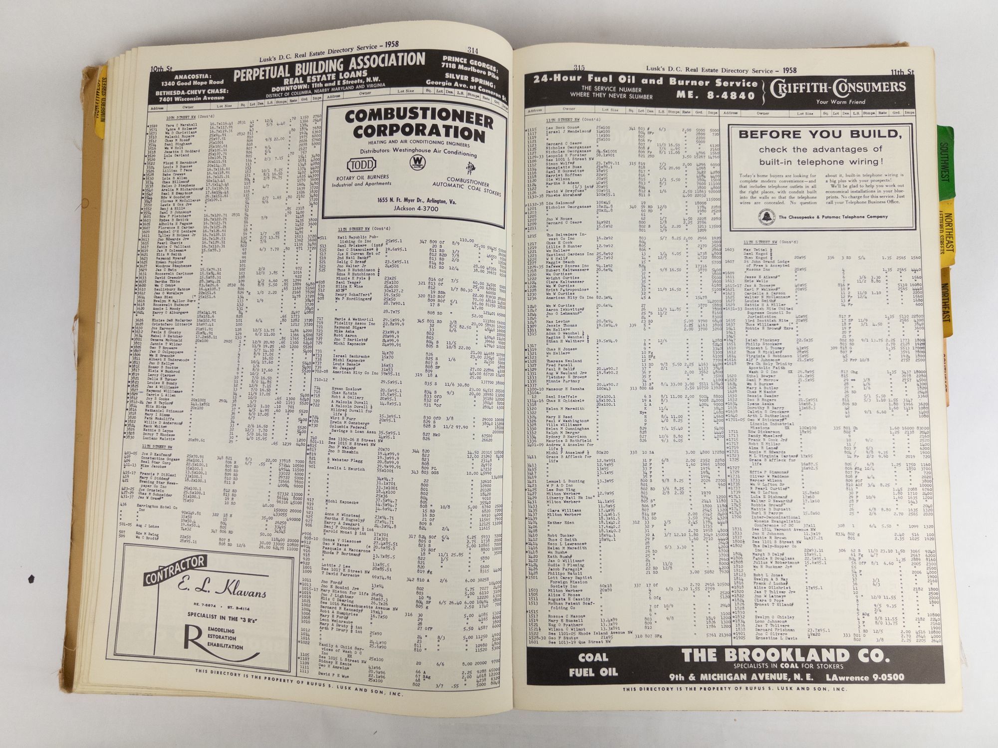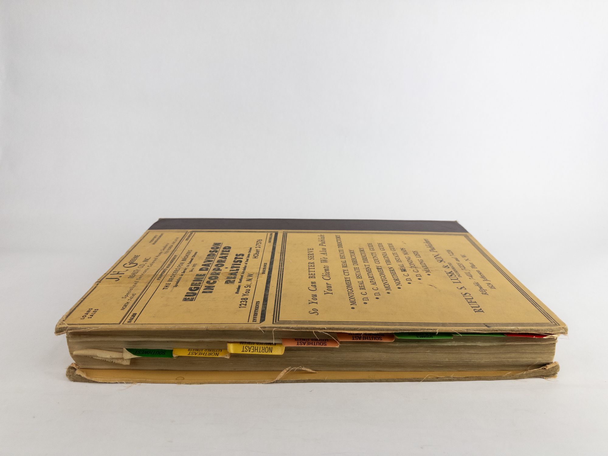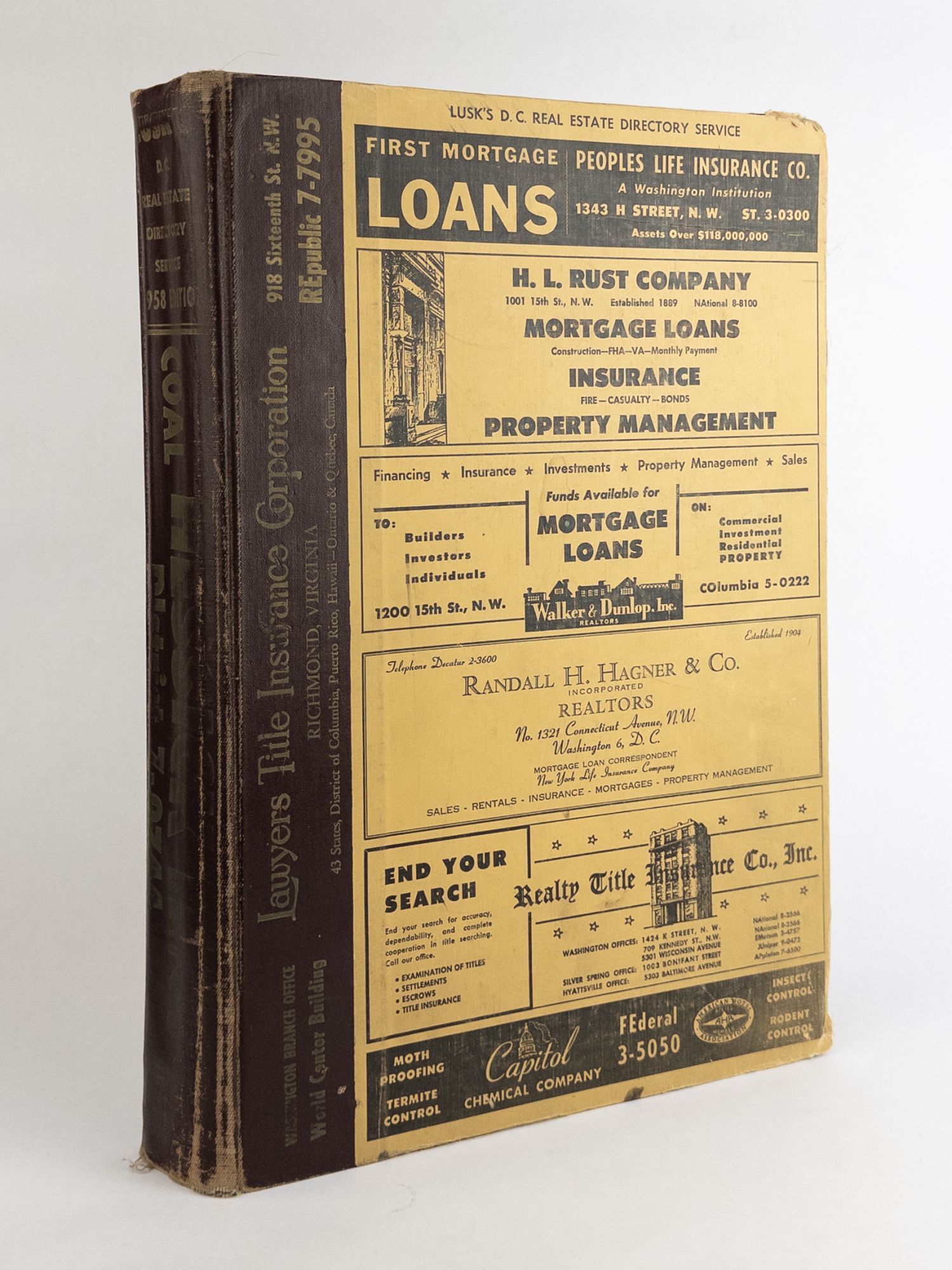 Washington, D.C.: Rufus S. Lusk & Son, Inc, 1958. 1958 Edition. Hardcover. Quarto, 786 pages. In Good minus condition. Bound in publisher's quarter leather and tan printed cloth boards with gilt lettering to spine. Fading to text on spine. Heavy fraying and wear to corners of boards. Rubbing to head and tail of spine, edges, and hinges. Scuffing and staining to boards. Tearing to rear board. Black text printed on top and bottom edges of textblock. Multicolored tabs to fore edge, worn to various degrees. Age toning and light staining to endpapers and pastedowns. Binding loosening with gutter visible between endpapers and pastedowns. Two loose copies of insert for pages 585A-H present. Light age toning throughout. Shelved above Case 2. 1377944. Shelved Dupont Bookstore.
