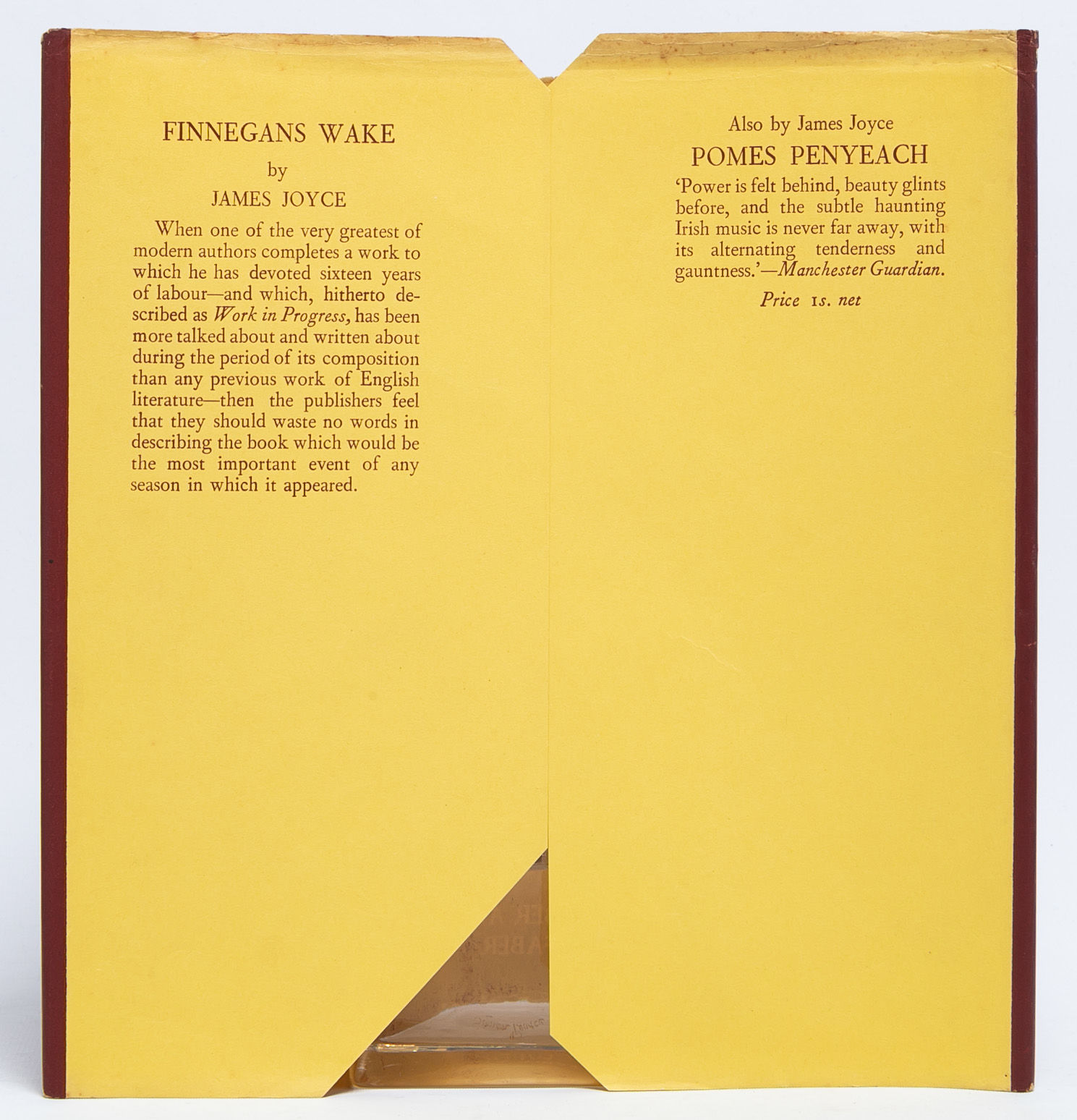 Among the most influential and complex Modernist works, Finnegans Wake "blends the reality of life with a dream world. The motive of the novel, inspired by the 18th century Italian philosopher Giambattista Vico, is that history is cyclical...the novel's plot is nearly as complex as the linguistic tactics deployed by Joyce, who combined a number of languages and utilized complex sonic implications to create an atmosphere of wordplay and hidden meaning throughout the entirety of Finnegans Wake" (Britannica). A natural progression from his earlier masterpiece Ulysses, Finnegans Wake shows Joyce pressing his ability to weave together numerous languages, cultural mythologies, and national literatures to defy boundaries and binaries we so often lean on to understand the world. Near Fine in Very Good + dust jacket.