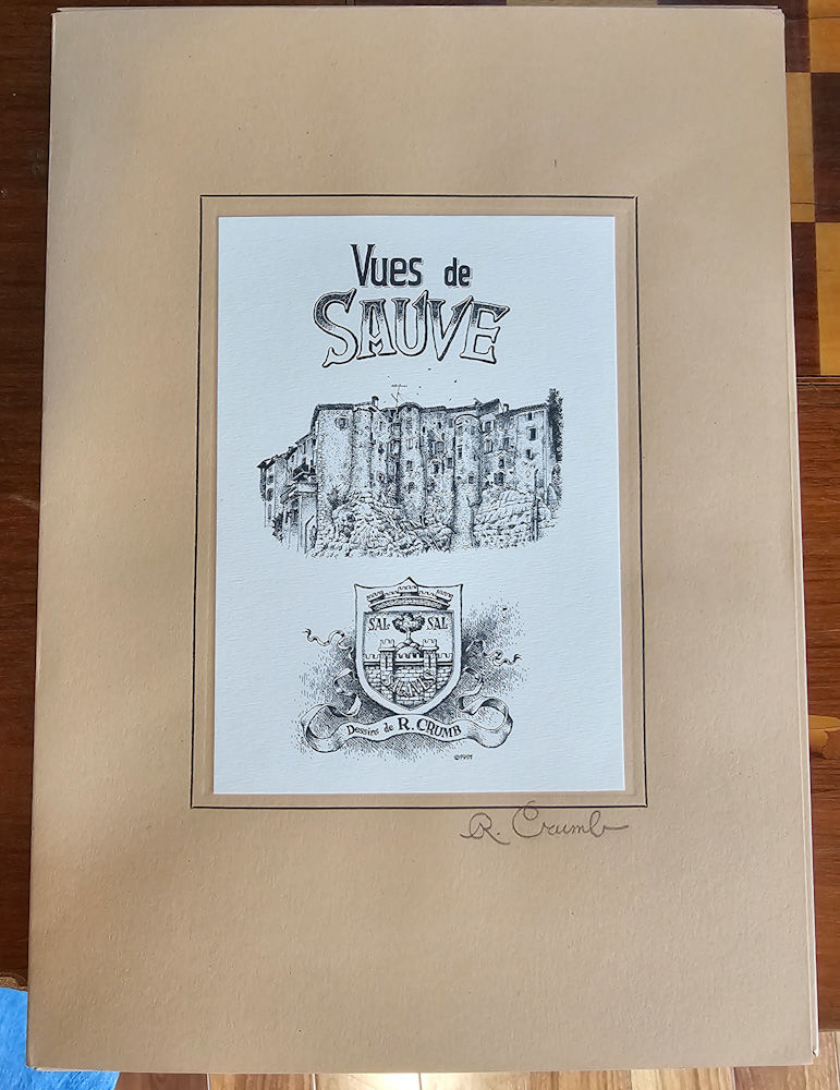 [Galérie Vidourle Prix], 1991. First Edition. Prints. Fine. Robert Crumb. Portfolio of 8 prints (8-1/2" x 12") of Crumb drawings, all picturing his home and its locale in the South of France, housed in a paper portfolio with a title print pasted on the center. The portfolio is SIGNED by Crumb on the front cover beneath the title print.