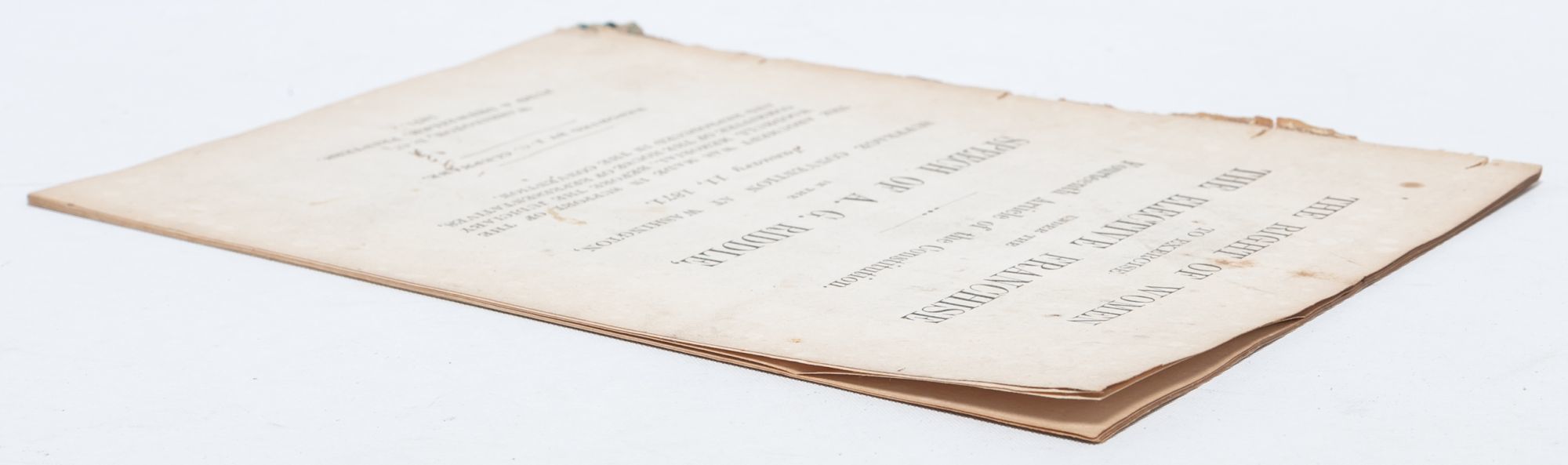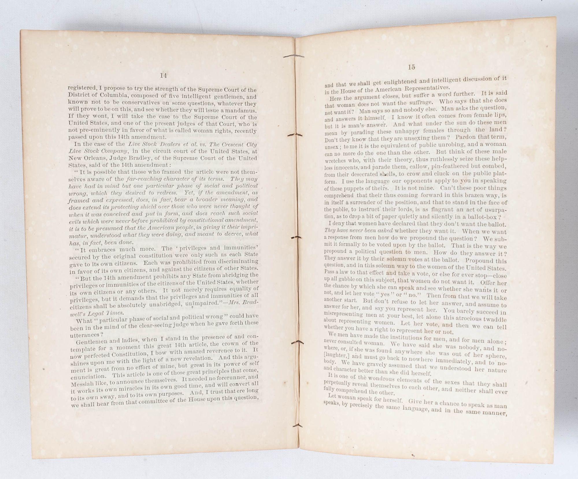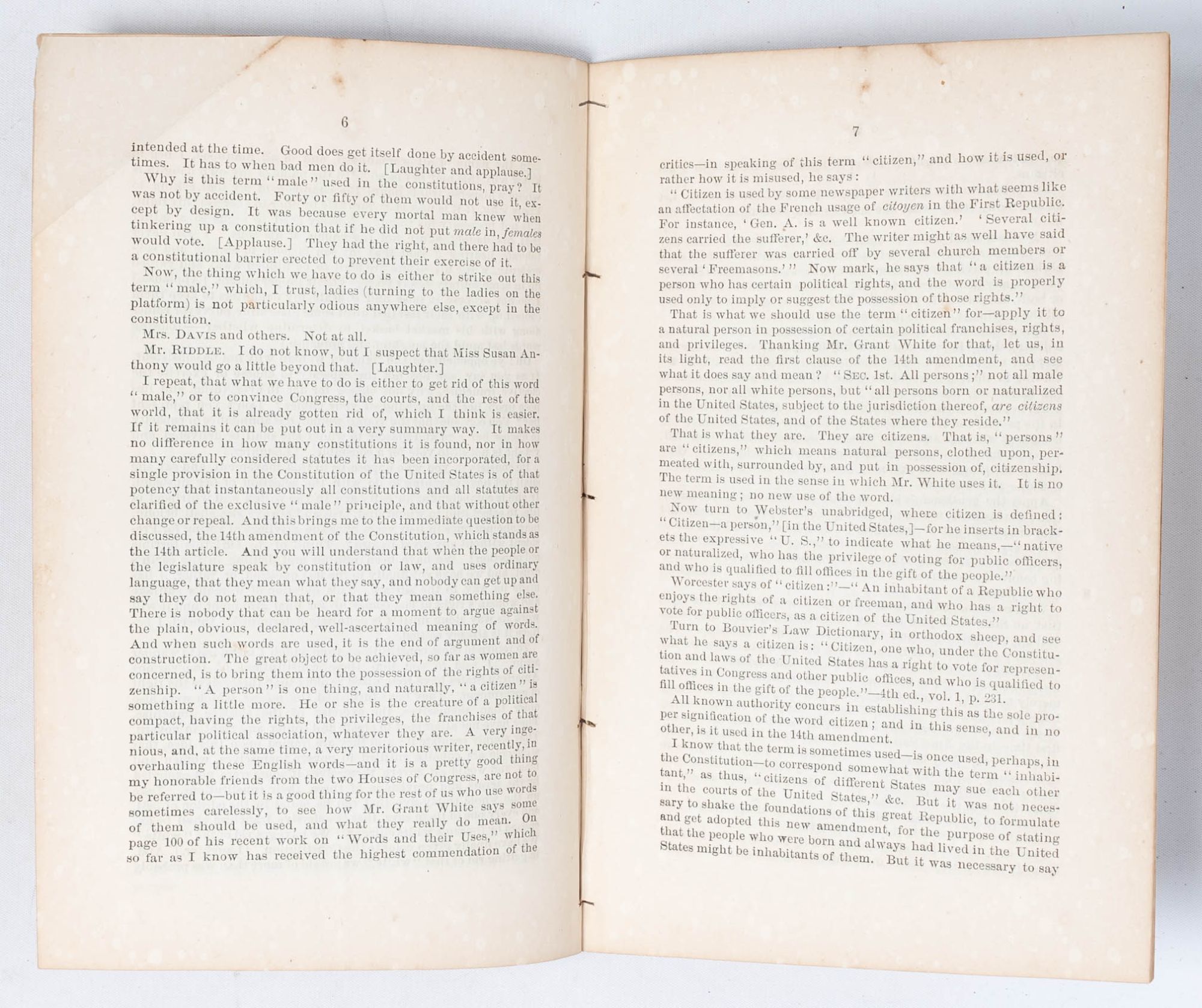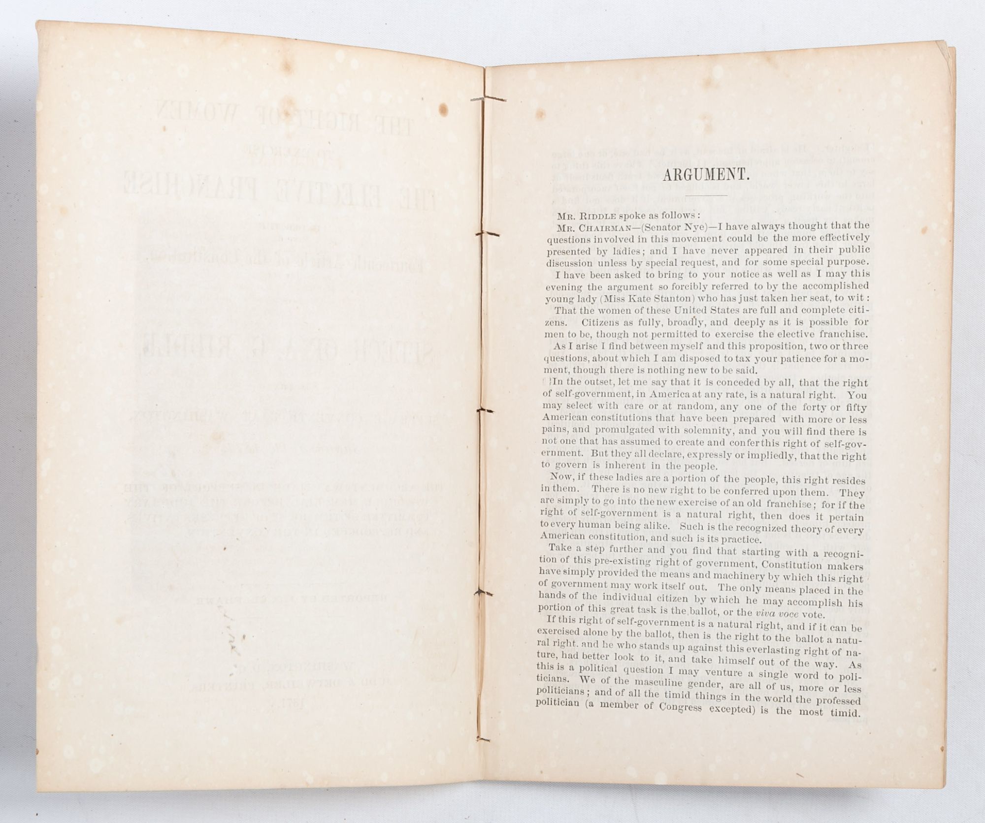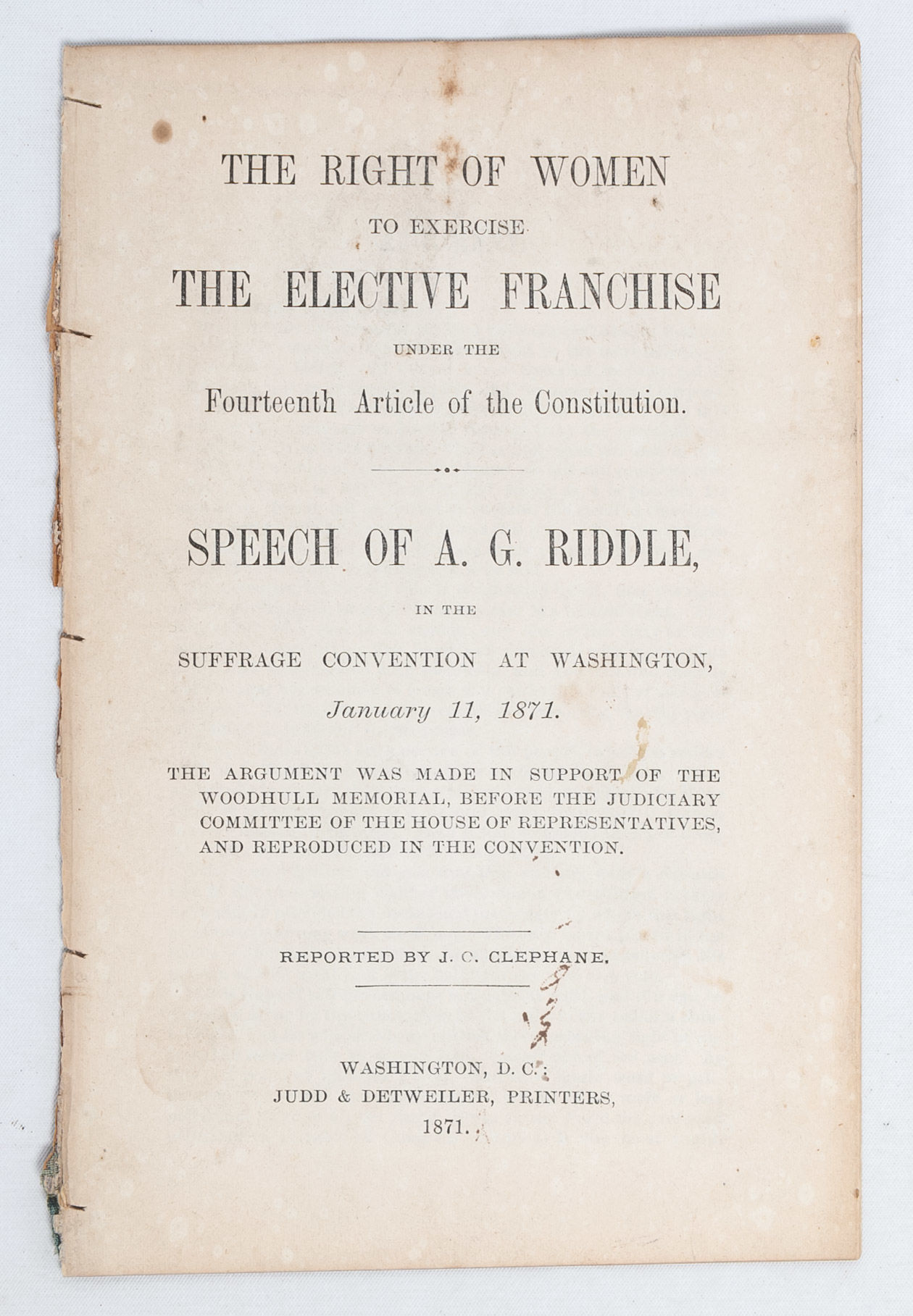 On January 11, 1871 two historic speeches occurred: one, through which Victoria Woodhull became the first woman to testify before a Congressional committee, and the present, through which Congressman A. G. Riddle of Ohio supported that work in an act of allyship to Victoria Woodhull herself and to the constituents represented by Elizabeth Cady Stanton and Susan B. Anthony. From his opening, Riddle asserts that he is only present because the law prohibits women's free public exercise of speech in front of the Judiciary Committee: "I have always thought that the questions involved in this movement could be more effectively presented by ladies; and I have never appeared in their public discussion except by special request...I have been asked to bring to your notice as well as I may this evening the argument...that the women of these United States are full and complete citizens. Citizens as fully, broadly, and deeply as it is possible for men to be, though not permitted to exercise the elective franchise." For the remainder of the speech, Riddle draws on the language and logical scaffolding so carefully constructed for decades by the suffragists surrounding him. The Constitution guarantees women's citizenship but disenfranchises them through the use of the word "men." The creation of the Fourteenth Amendment and its use of "citizens" and "people" properly adjusts this to include them. No new amendment is necessary; what men simply need to do is acknowledge that "the right to self government is a natural right, [and] it does pertain to every human being alike," meaning that women already have the right to vote, its exercise is simply being denied. "There is no new right to confer upon them. They are simply to go into the new exercise of an old franchise." Ultimately, "We do not need any 16th Amendment. We need only intelligent, firm, decisive and deciding." And he promotes the National Woman Suffrage Association's action plan of civil disobedience: "I propose to offer Mrs. Griffing and two or three other ladies for registration, two or three months hence when the time comes, here. If they are not registered, I propose to try the strength of the Supreme Court of the District of Columbia...If they won't, I will take the case to the Supreme Court of the United States."
