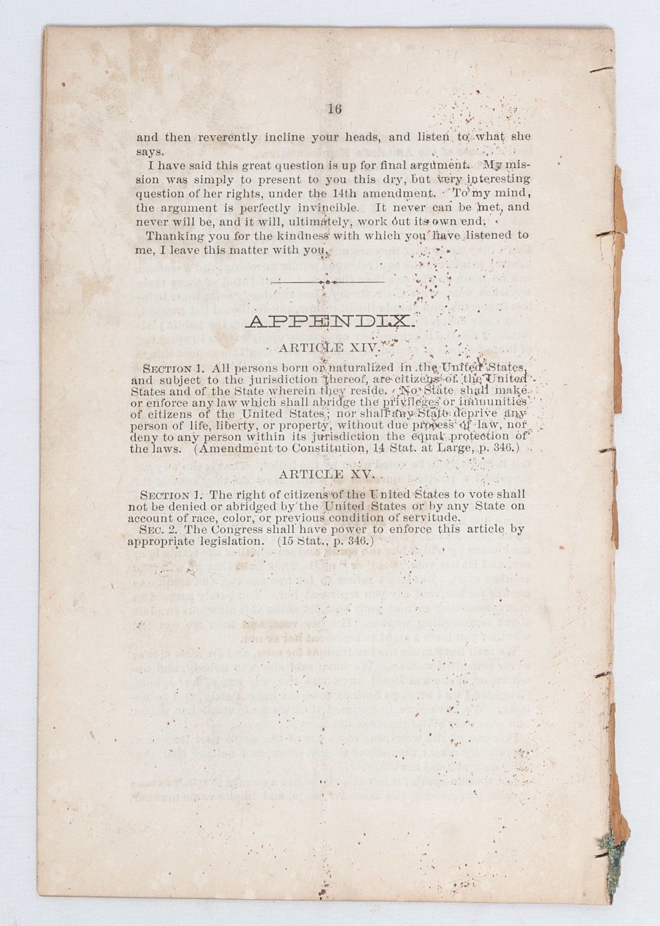 Notably, what Riddle encouraged was what Susan B. Anthony and the NWSA enacted: a campaign of women registering to vote or voting, which led to their arrests and trials, and then to a decision by the Supreme Court that went against their favor. The next steps, over the following six years, was to pursue a 16th Amendment -- and to deploy far more racist dog-whistles than the egalitarian speech here that relies on both Black Americans and women being covered by the 14th Amendment. As the NWSA became more aggressive in aligning itself with white supremacist men and arguing for the necessity of white women's enfranchisement to counteract the "muddying" of elections, it left behind some of the most empowering ideas featured in this speech, that "we have given color to the Constitution" by having "got rid of the 'white'," and that this was a strength.