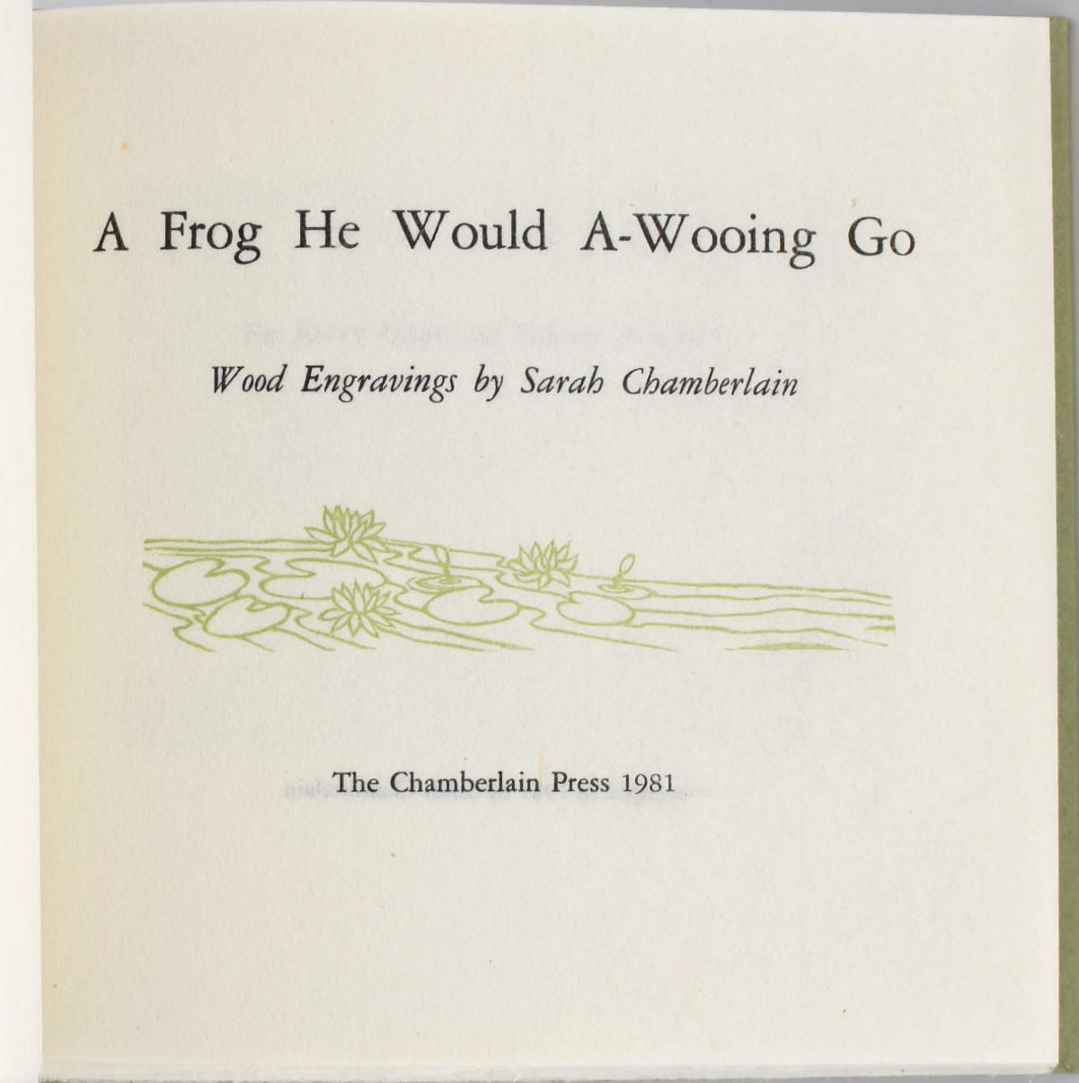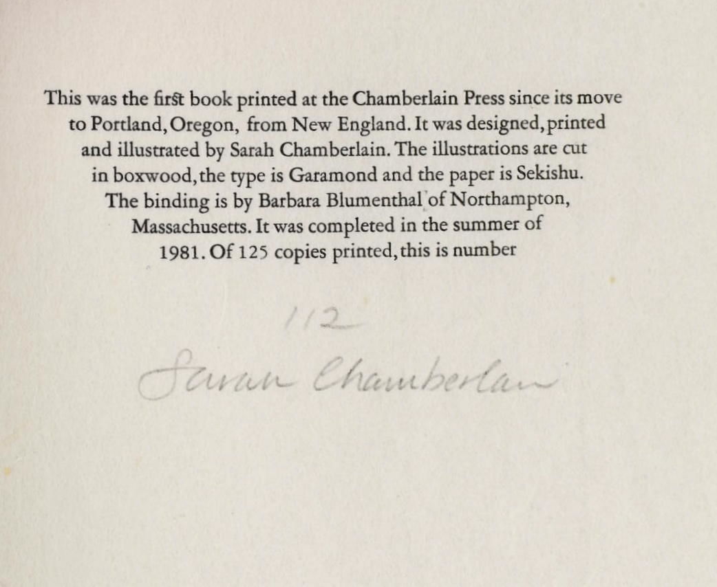 [Portland, Oregon]: The Chamberlain Press, 1981. Limited Edition. Hard Cover. Near Fine binding. Oblong 8vo.; in green printed paper covered boards, sewn in the japanese style stab binding with green silk thread; [23] pages with illustrations.~~From the colophon: "This was the first book printed at the Chamberlain Press since it's move to Portland, Oregon, from New England. It was designed, printed and illustrated by Sarah Chamberlain. The illustrations are cut in boxwood, the type is Garamond, and the paper is Sekishu. The binding is by Barbara Blumenthal of Northampton, Massachusetts. It was completed in the summer of 1981. Of 125 copies printed, this is 112." Signed in pencil by Sarah Charmbelain.~~There are seven full page illustrations, with ornaments printed in pale green and yellow. Near Fine binding.