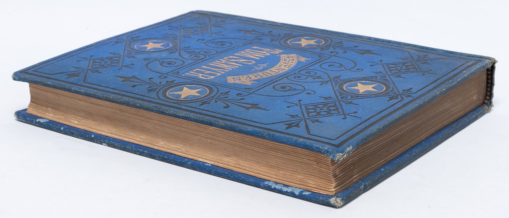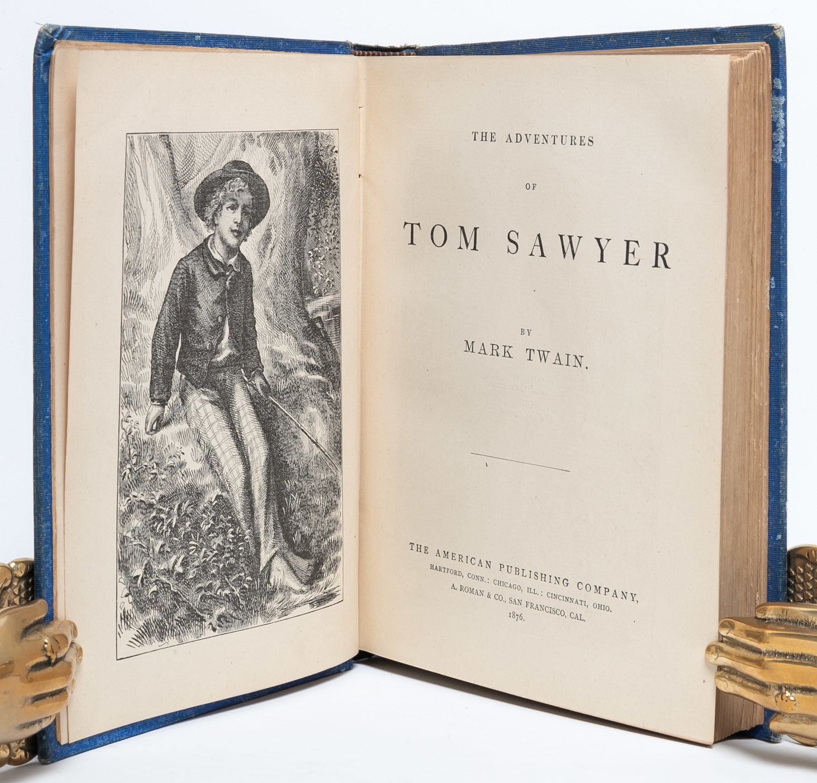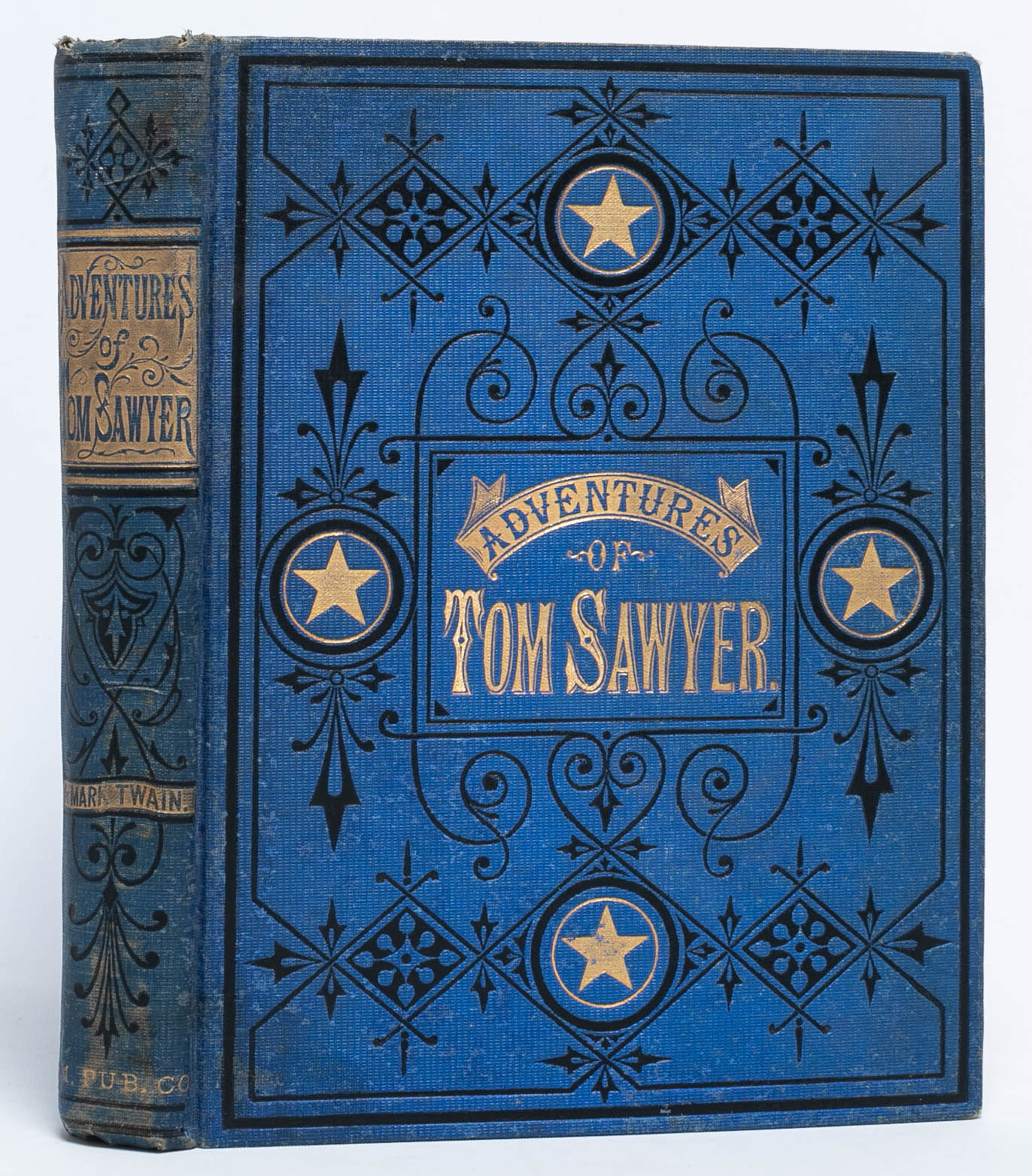 Hartford, Conn: The American Publishing Company, 1876. 2nd Printing. Very Good +. Second printing. Original blue cloth, decoratively stamped and lettered in gilt and black, peach coated endpapers. Frontispiece and numerous wood-engraved text illustrations by True Williams and others, 4-page publisher's advertisements at end (dated Dec. 1, 1876), half-title printed on the verso of the frontispiece. A Very Good+ copy overall. Minor wear to the spine ends and extremities, some discoloration to the spine and the rear board. A contemporary owner's gift inscription on one of the early blanks (dated Feb. 22, 1877). Rear paste-down and endpapers a bit wrinkled, apparently from a dampstain. Text block clean and unaffected.