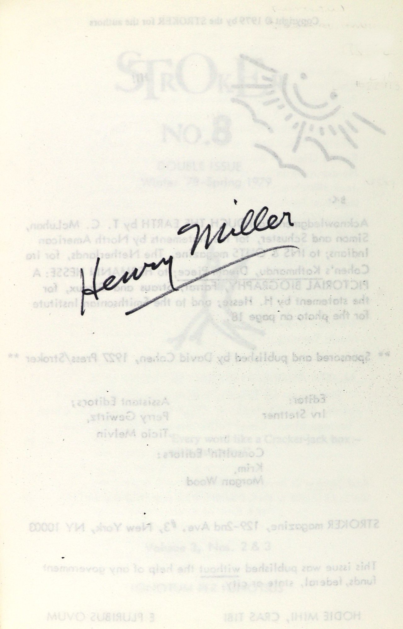 New York: Stroker Magazine, 1979. Very Good. New York: Stroker Magazine, 1979. First Edition. Signed by Henry Miller without inscription on flyleaf. Octavo; 44pp. Side-stapled illustrated wraps. Covers lightly shelfworn with a couple light crimps along spine. Binding is sound and pages unmarked.