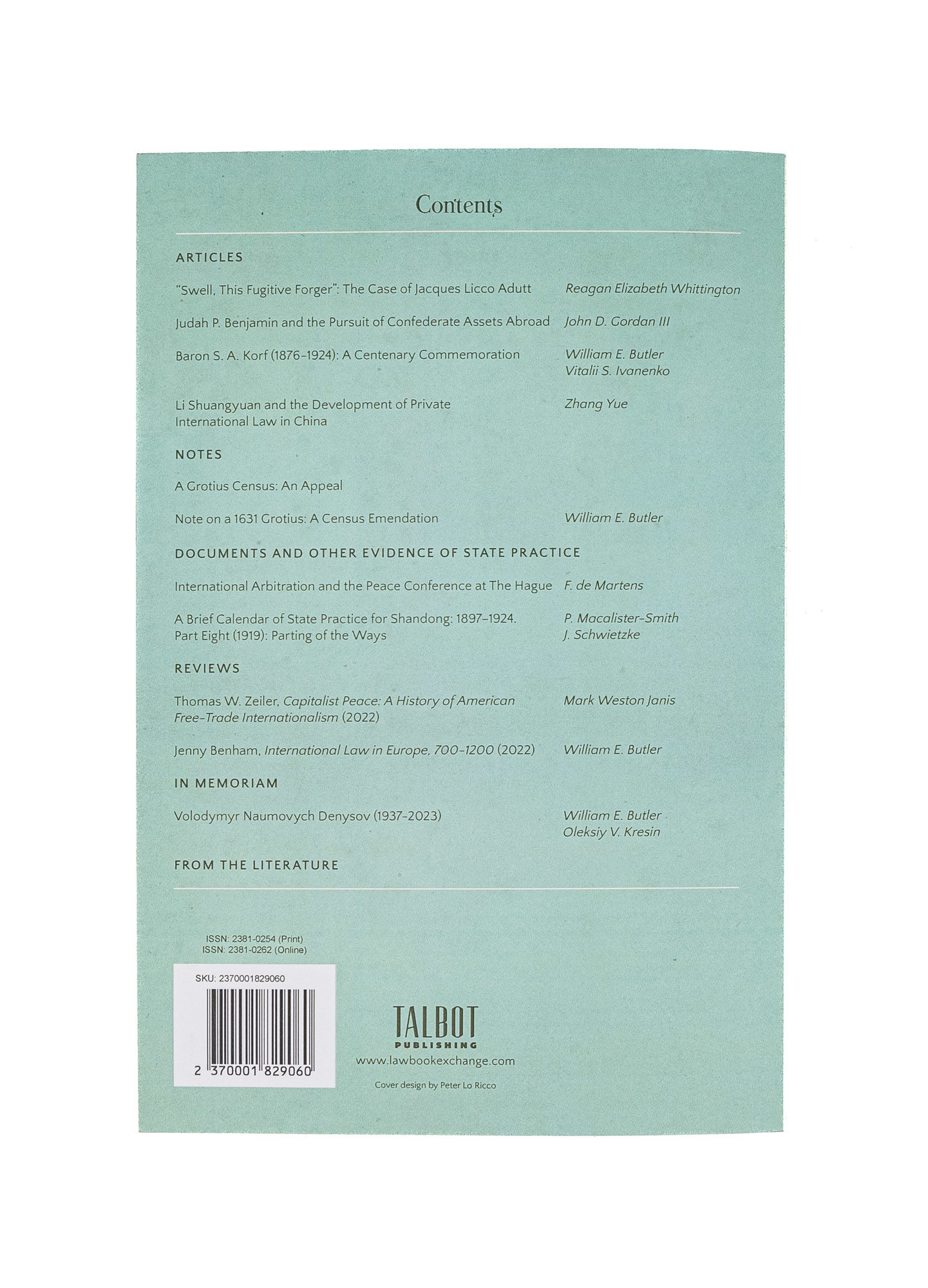 2024. Jus Gentium. Journal of International Legal History. William E. Butler, Editor. Talbot Publishing, 2024. Volume 9, No. 1. January 2024. 322 pp. Paperback. $50. * JUS GENTIUM Journal of International Legal History is the first dedicated journal in the United States addressing the history of international law. Much current scholarship on the history of international law is preoccupied not with international law, but with international legal doctrine; the doctrinal writings of remarkably few individuals dominate the discourse while the rest remain unseen or overlooked. This journal will encourage further exploration in the archives, for new materials and confirmation of the accuracy of past uses, and welcomes the continued reassessment of international legal history in all of its dimensions. Vol. 9, No. 1 | January 2024. ARTICLES: "Swell, This Fugitive Forger": The Case of Jacques Licco Adutt Reagan Elizabeth Whittington. Judah P. Benjamin and the Pursuit of Confederate Assets Abroad John D. Gordan III Baron S. A. Korf (1876-1924): A Centenary Commemoration William E. Butler; Vitalii S. Ivanenko Li Shuangyuan and the Development of Private International Law in China. Zhang Yue. NOTES A Grotius Census: An Appeal Note on a 1631 Grotius: A Census Emendation William E. Butler DOCUMENTS AND OTHER EVIDENCE OF STATE PRACTICE International Arbitration and the Peace Conference at The Hague F. de Martens A Brief Calendar of State Practice for Shandong: 1897-1924. Part Eight (1919): Parting of the Ways P. Macalister-Smith; J. Schwietzke REVIEWS Thomas W. Zeiler, Capitalist Peace: A History of American Free-Trade Internationalism (2022). Mark Weston Janis Jenny Benham, International Law in Europe, 700-1200 (2022) William E. Butler IN MEMORIAM Volodymyr Naumovych Denysov (1937-2023) William E. Butler;Oleksiy V. Kresin FROM THE LITERATURE.