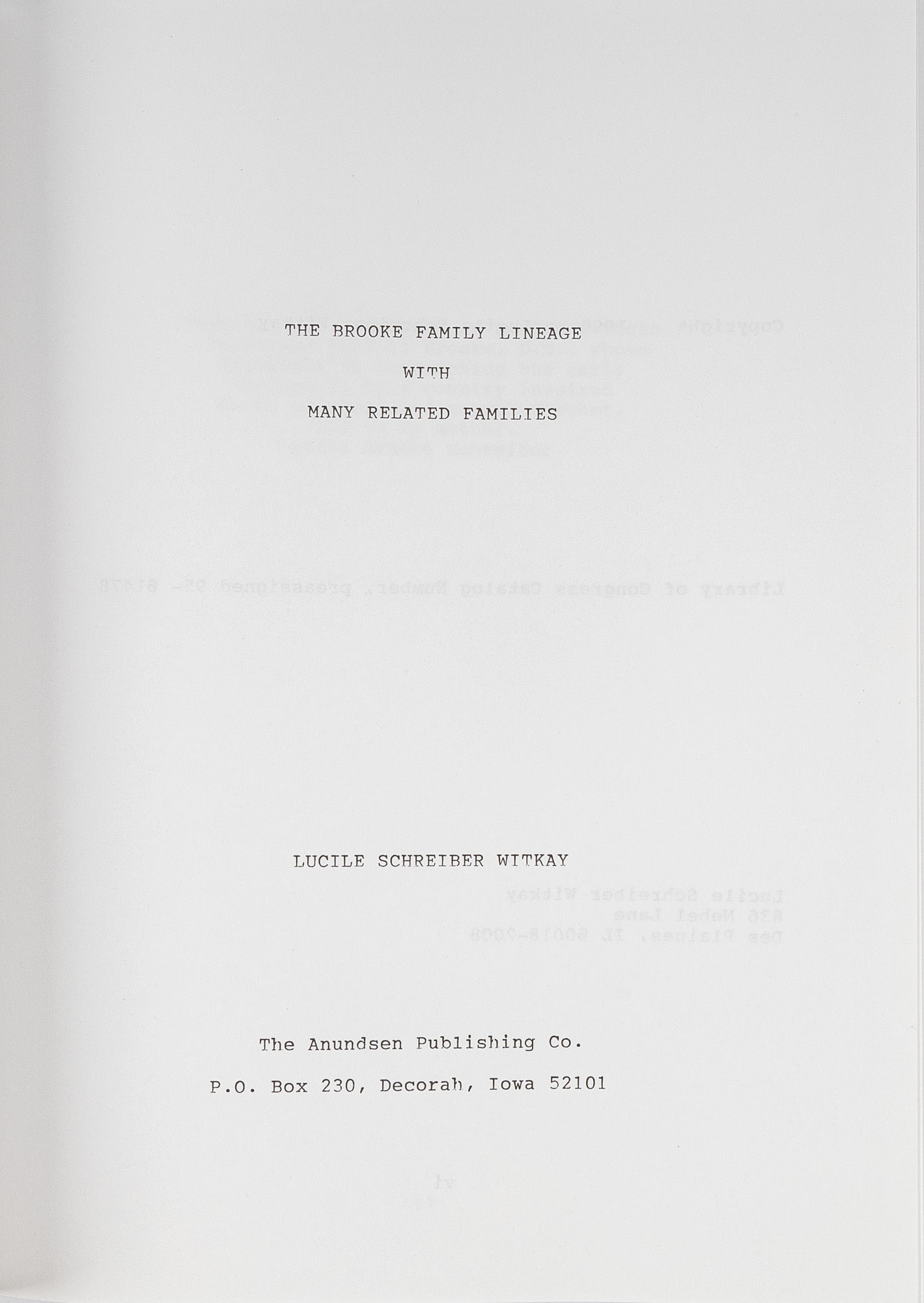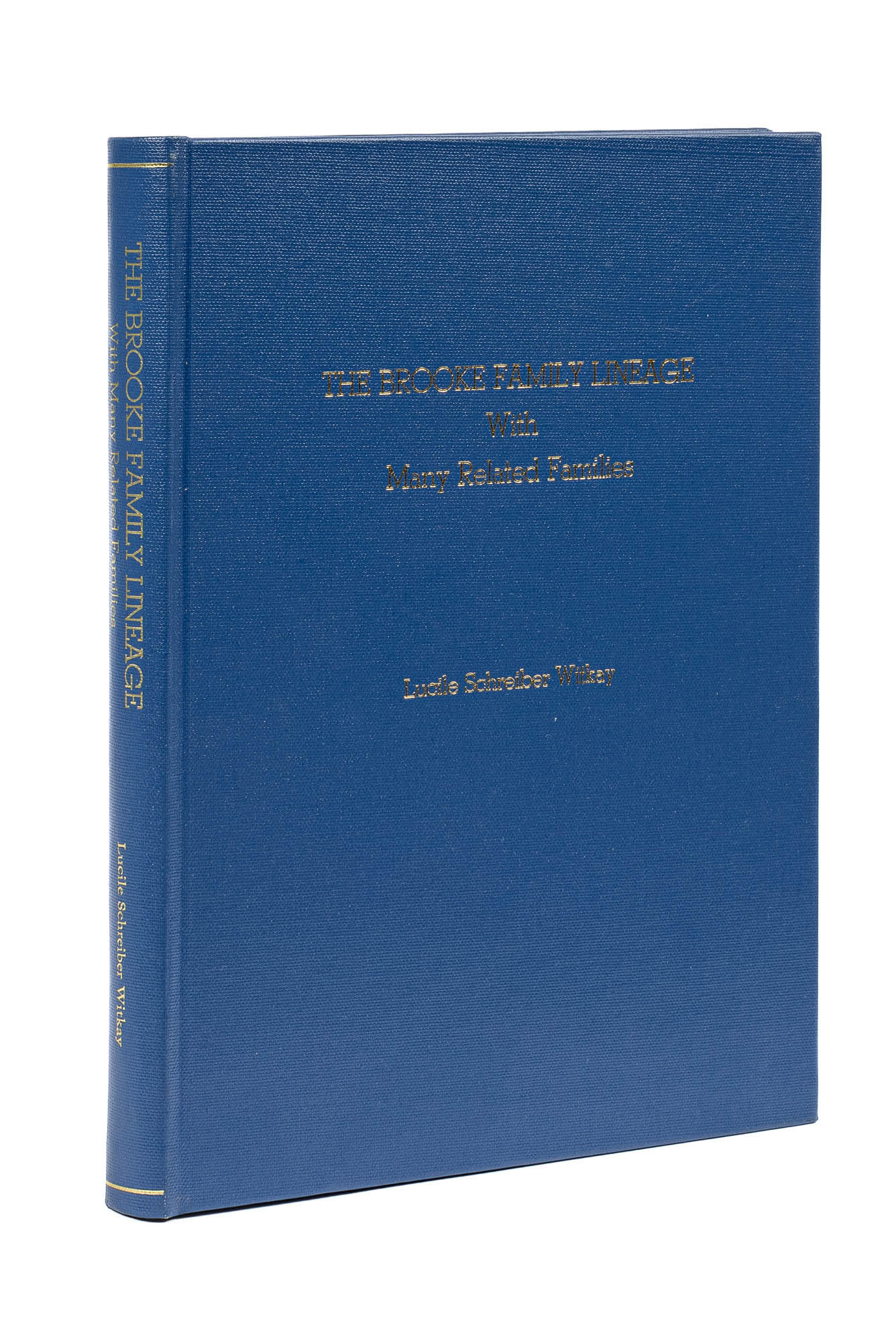 1996. Witkay, Lucile Schreiber. The Brooke Family Lineage With Many Related Families. Decorah, IA: The Anundsen Publishing Co., 1996. 253 pp. illustrations. Blue cloth with gilt stamped spine and front cover. Fine. Internally clean and bright. $50. * Touches on the genealogy of U.S. Supreme Court Chief Justice Roger Brooke Taney [1777-1864].