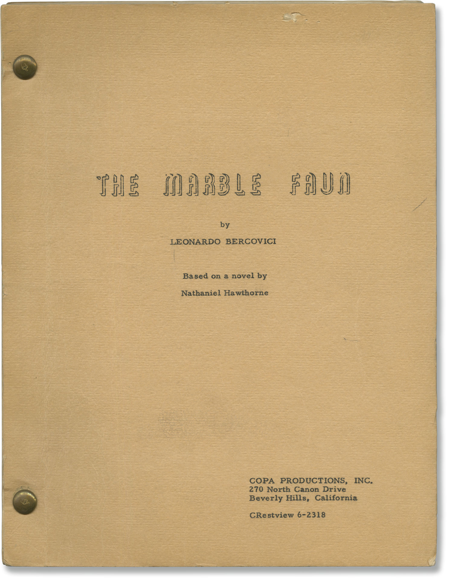 Tan titled wrappers, with credits for screenwriter Leonardo Bercovici and author Nathaniel Hawthorne. Title page present, dated January 15, 1957, with credits for screenwriter Leonardo Bercovici and author Nathaniel Hawthorne. 121 leaves, with last page of text numbered 120. Mimeograph duplication, rectos only. Pages Very Good plus, wrapper Very Good plus, bound with two gold brads.