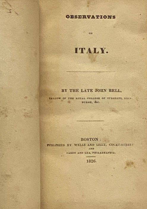 Boston: Wells and Lilly, 1826. First American Edition. Hard Cover. Good/No Jacket. First American edition. Rebacked with plain brown cloth, new headband, endpapers, and flyleaves. Boards lightly foxed with minor internal chip to paper on rear board, a few text pages lightly foxed. 1826 Hard Cover. xii, 331 pp. 8vo. A 19th century Italian travelogue "[o]n Milan, Florence, Rome and Naples, in 1817-18," by the Scottish anatomist and fellow of the Royal Academy of Surgeons who is considered an innovator in the field of vascular surgery (Pine-Coffin 8178. This work is based on a journey to Italy Bell undertook as an effort to improve his health following a fall from his horse. His published works in the field of medicine include Discourses on the Nature and Cure of Wounds, Principles of Surgery, and Anatomy of the Human Body.
