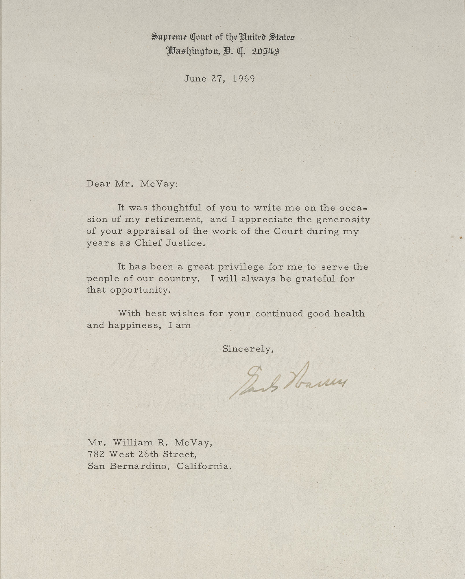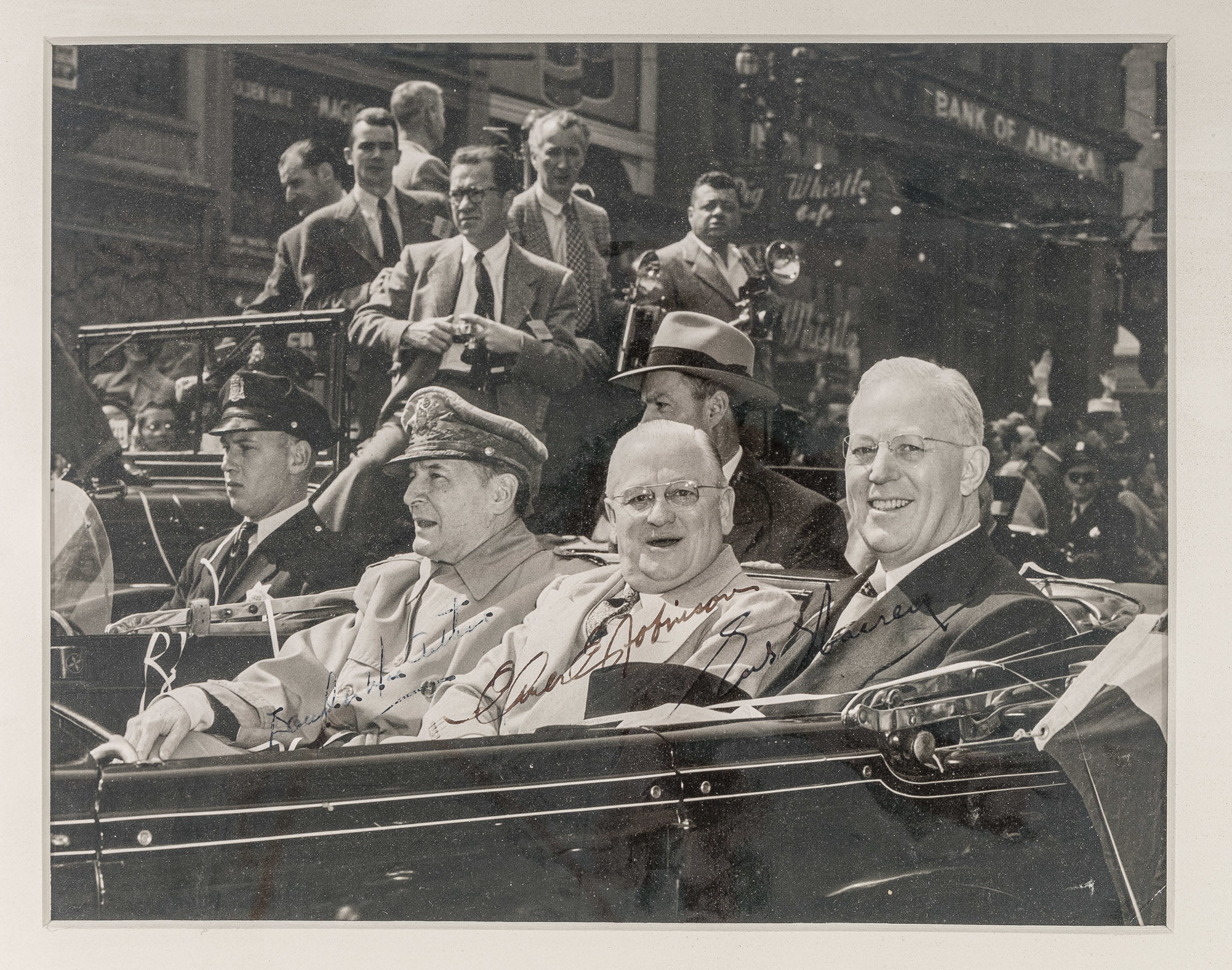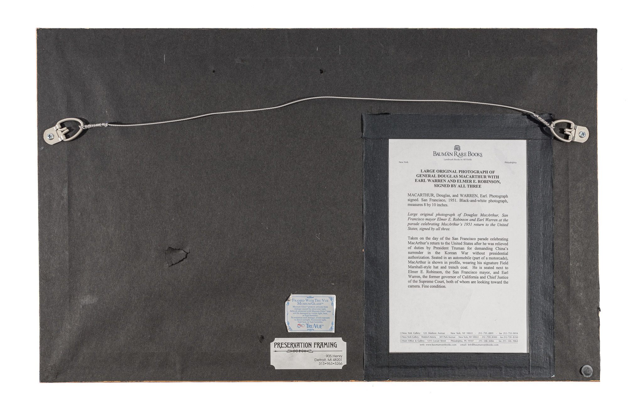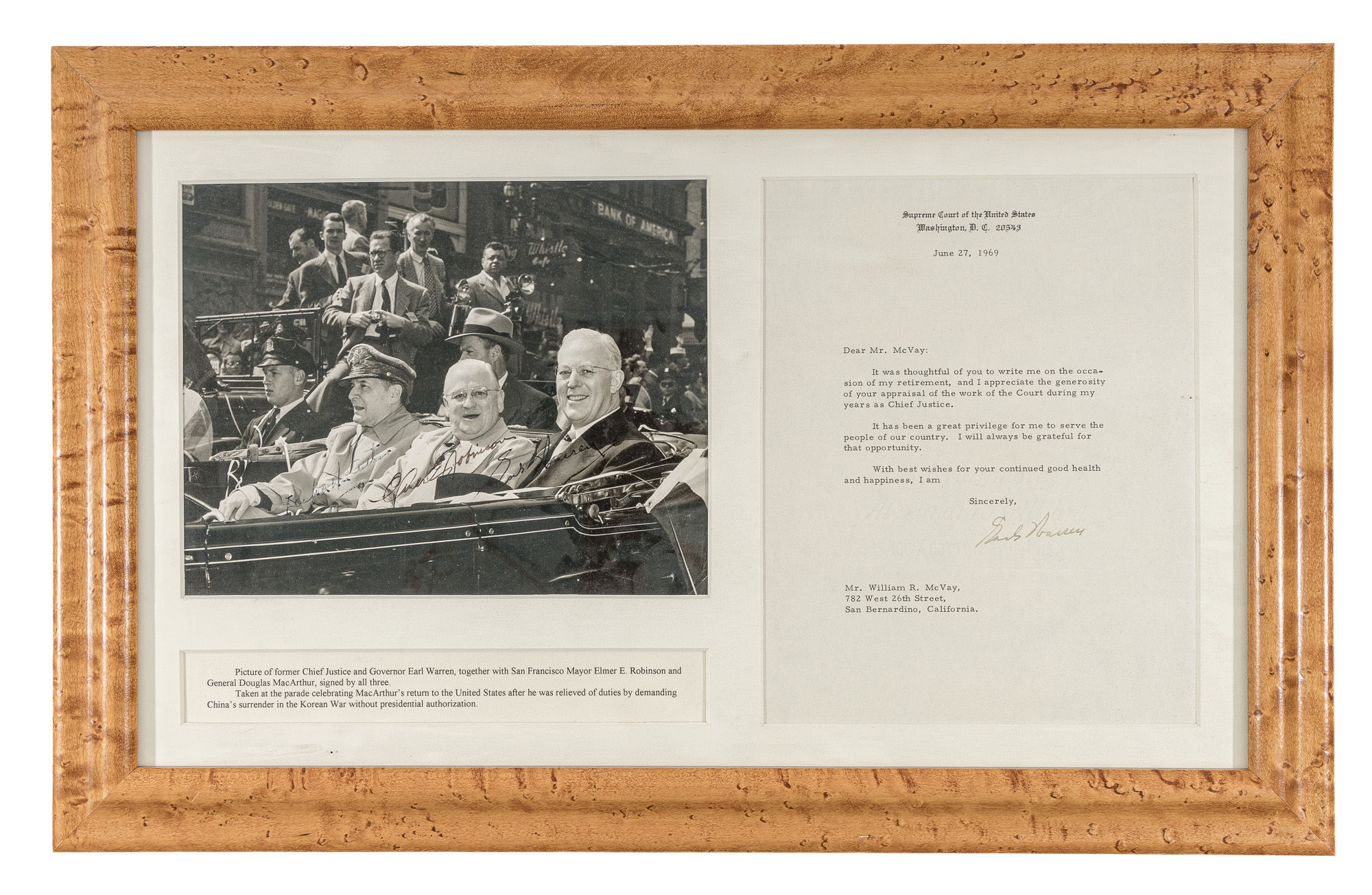 1951. Large Photograph of General Douglas MacArthur with Earl Warren and Elmer Robinson, Signed by All Three Warren, Earl [1891-1974]. MacArthur, Douglas [1880-1964]. Robinson, Elmer [1894-1982]. [8" x 10" Black-and-White Photograph of Douglas MacArthur, Elmer Robinson and Earl Warren]. [San Francisco, 1951]. With autograph signatures of MacArthur, Robinson and Warren. [With] Warren, Earl. [Typed Letter, Signed, On U.S. Supreme Court Letterhead, To William R. McVay, Washington, DC, June 27, 1969]. 1 pp. Together two items in attractively matted and glazed 14-1/4" x 22-1/4" frame. Fine, horizontal fold lines to letter. $1,500. * The photograph was taken on the day of the San Francisco parade celebrating MacArthur's return to the United States. He had previously been relieved of duties by President Truman for demanding China's surrender in the Korean War without presidential authorization. Seated in an automobile (part of a motorcade), MacArthur is shown in profile, wearing his signature Field Marshall-style hat and trench coat. He is seated next to Elmer E. Robinson, the San Francisco mayor, and Earl Warren, the former governor of California and Chief Justice of the Supreme Court, both of whom are looking toward the camera. Warren's letter thanks McVay for good wishes sent to Warren upon his retirement in 1969.