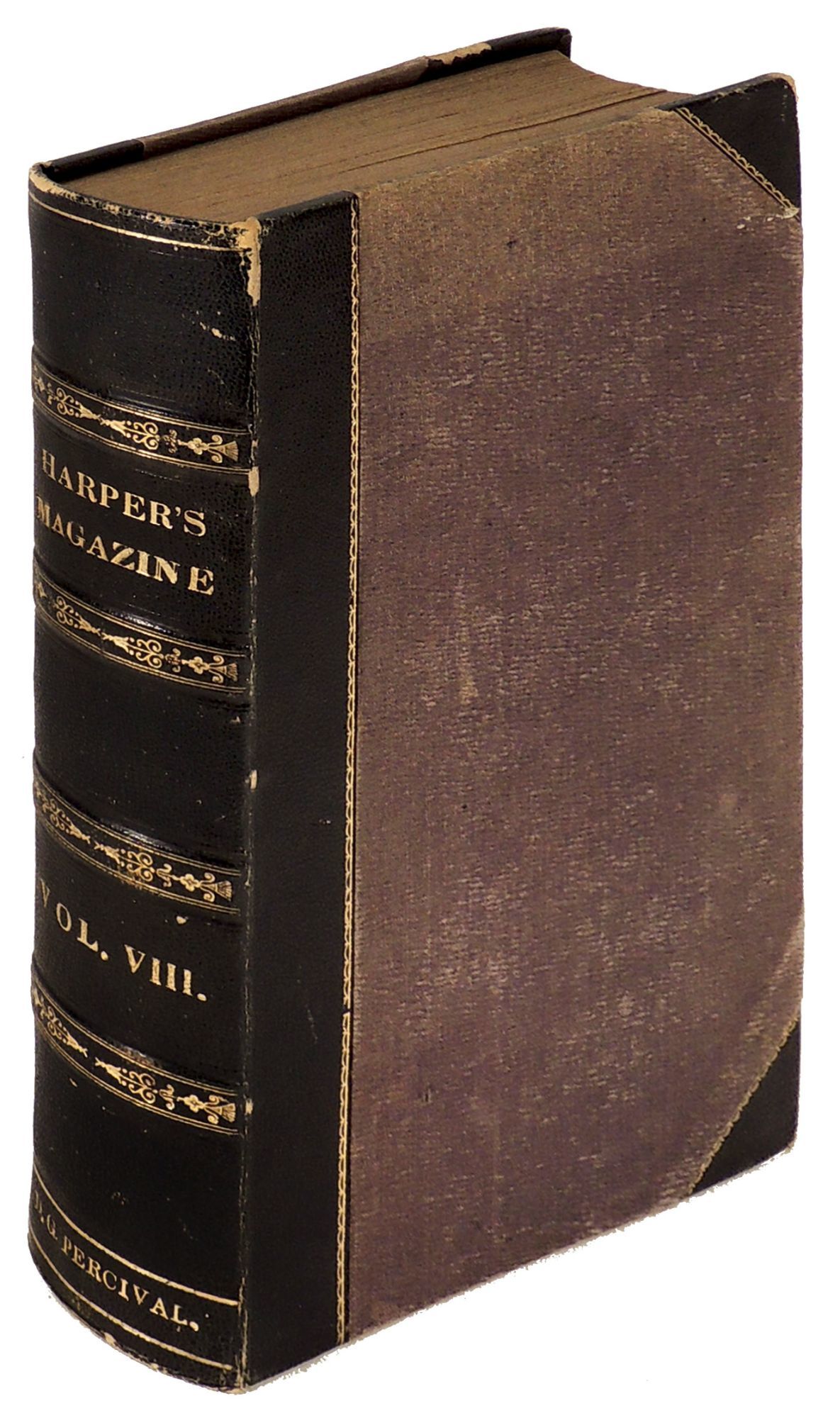 New York: Harper & Brothers, 1853. Hardcover. Very Good. Hardcover. Includes Melville's short story "Cock a Doodle Doo - The Crowing of the Cock Beneventano" on page 77 - 86, Charles Dickens' "School Boy Stories", and chapters 4 - 20 of Thackeray's "The Newcomes." Bound in three quarter black leather with maroon cloth covered boards and gilt title and raised bands to spine. Marbled endpapers. Rubbing to boards and minor wear to edges of boards, corners, and hinges. Foxing to interior and occasional small spots of soiling. Illustrated. Lacks fashion plate and cartoon page from several issues. 864 pages. PER/031424.