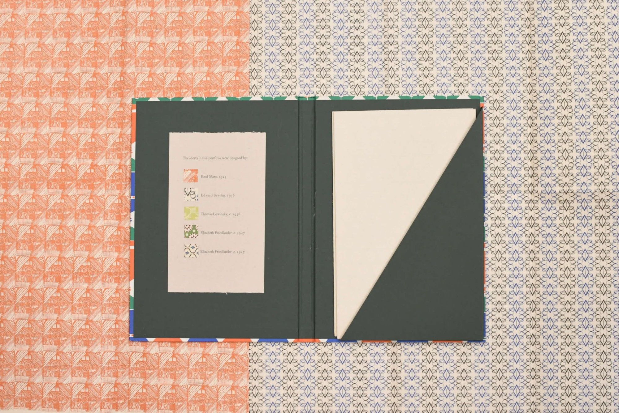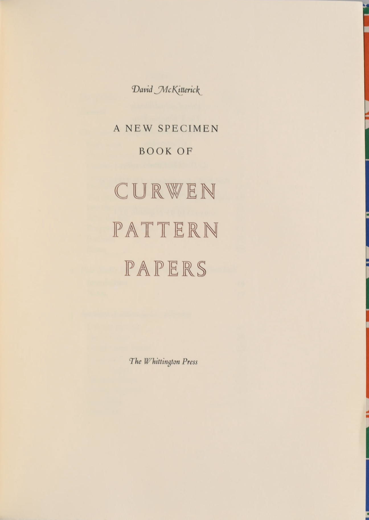 Manor Farm, Andoversford, Gloucestershire: The Whittington press, 1987. Limited Edition. Quarter Leather. Near Fine binding. Quarto; in quarter morocco over colorful paper covered boards; 105 pages, with 31 tipped in pattern paper samples (each sample being one twelfth of a whole sheet, the samples designed by Edward Bawden; Claud Lovat Fraser; Elizabeth Friedlander; Emil Otto Hoppe; Thomas Lowinsky; Enid Marx; Paul Nash; Sarah Nechamkin; Eric Ravilious; Michael Rothenstein; Albert Rutherston; Graham Sutherland; and with [8] photographic plated; with a separate portfolio containing five full sheets of pattern paper designed by Enid Marx, Edward Bawden; Thomas Lowinsky, and two sheets by Elizabeth Friedlander; trace of fade to the morocco spine, and a trace of discoloration to the spine of the portfolio.~~Limited ed. of 335 numbered copies. 250 copies are quarter-bound buckram and Curwen pattern paper, and 85 copies quarter bound in leather with 5 additional full sheets of pattern paper. ~~This is copy number IV of 85. The book and the portfolio are housed in a slipcase. Near Fine binding.