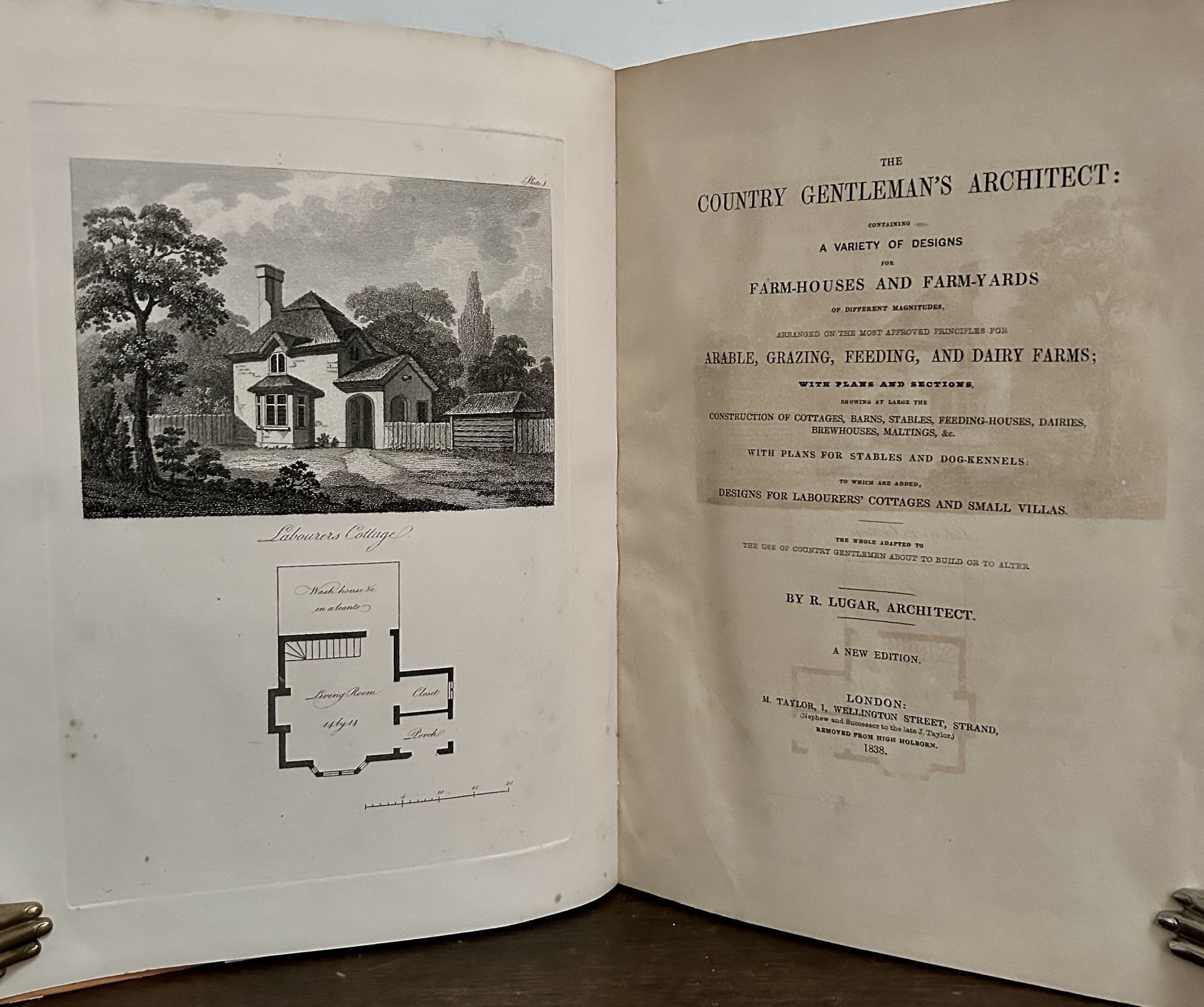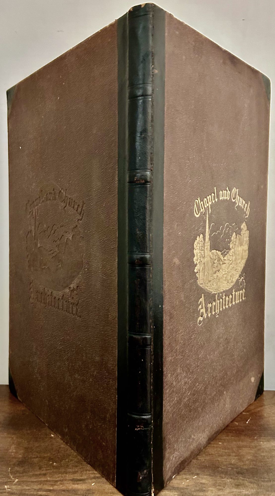 Boston & Cleveland: John R. Jewett & Jewett, Proctor & Worthington, 1856. First edition. Hardcover. Orig. three quarter black roan and brown cloth, front cover decorated and illustrated in gilt. Back cover with same design in blind. Near fine. 15 pages in text. Folio, 45.5 x 30 cm. Forty seven lithographed plates, 32 of which are chromolithographs. The superb plates were printed by Bufford's of Boston presenting simple wooden designs of country churches in the Anglo-Italian, Gothic, Byzantine, Romanesque, Norman and Grecian styles, and several parsonages. Materials include wood, granite and brownstone with the basic arrangement of an early 19th century meeting house -- longitudinal nave, tall tower, spine centralized on the gable end. His conservative designs illustrate the inherent conservatism and traditional New England perspective. Plates printed recto only with all plates very fresh and bright. Laid-in the original publisher prospectus for this work. Slight rubbing to extremities. HITCHCOCK 206, first and only edition.