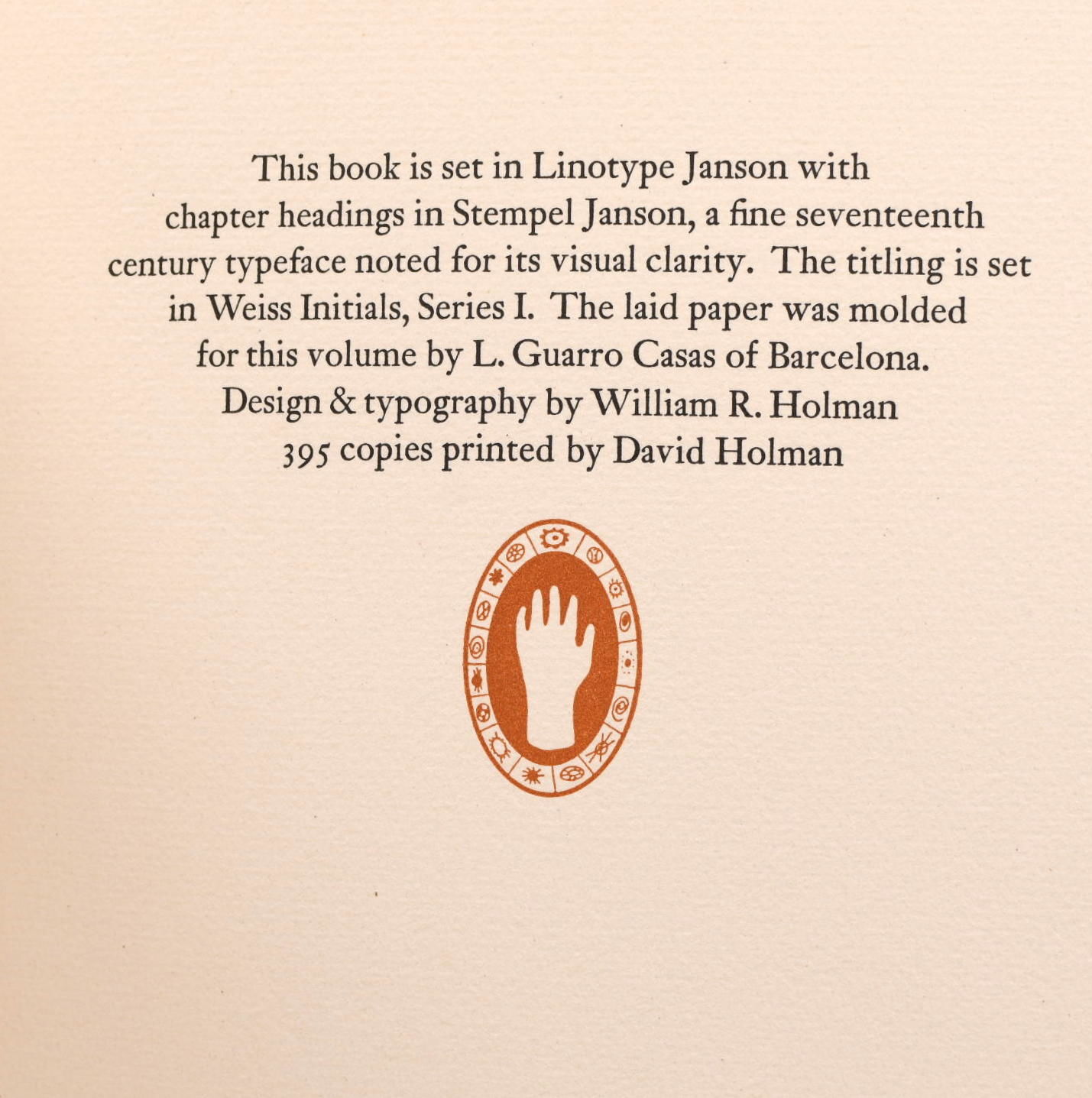 [Austin]: Roger Beacham, Publihser, 1975. Limited Edition. Hard Cover. Fine binding. Folio; in the publisher's mustard yellow cloth, with paper title to the spine and decorative paper roundel to the upper board; design and topography by David Holman; from an edition of 395 copies printed by David Holman; with the attractive name label of Irving W. Robbins, Jr. Fine binding.