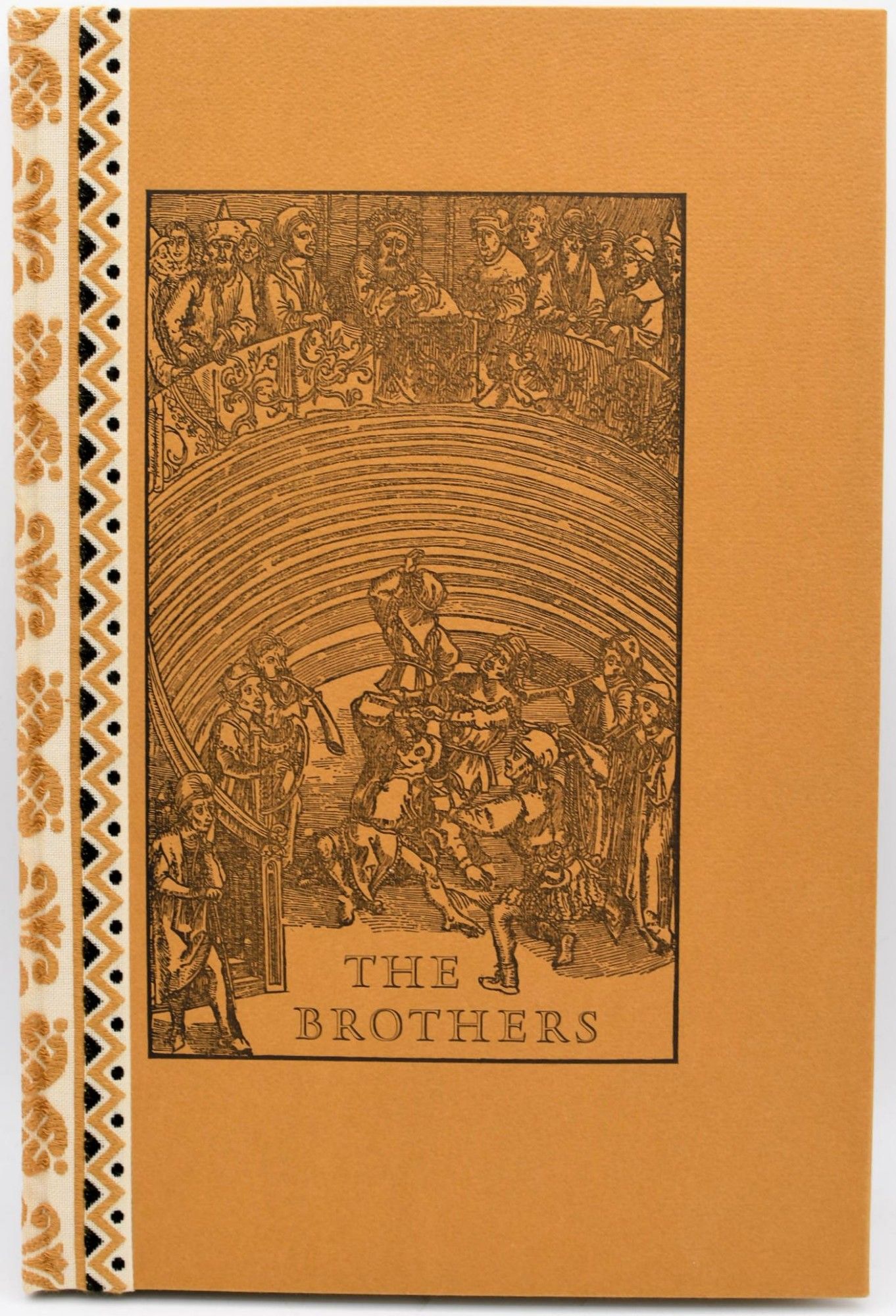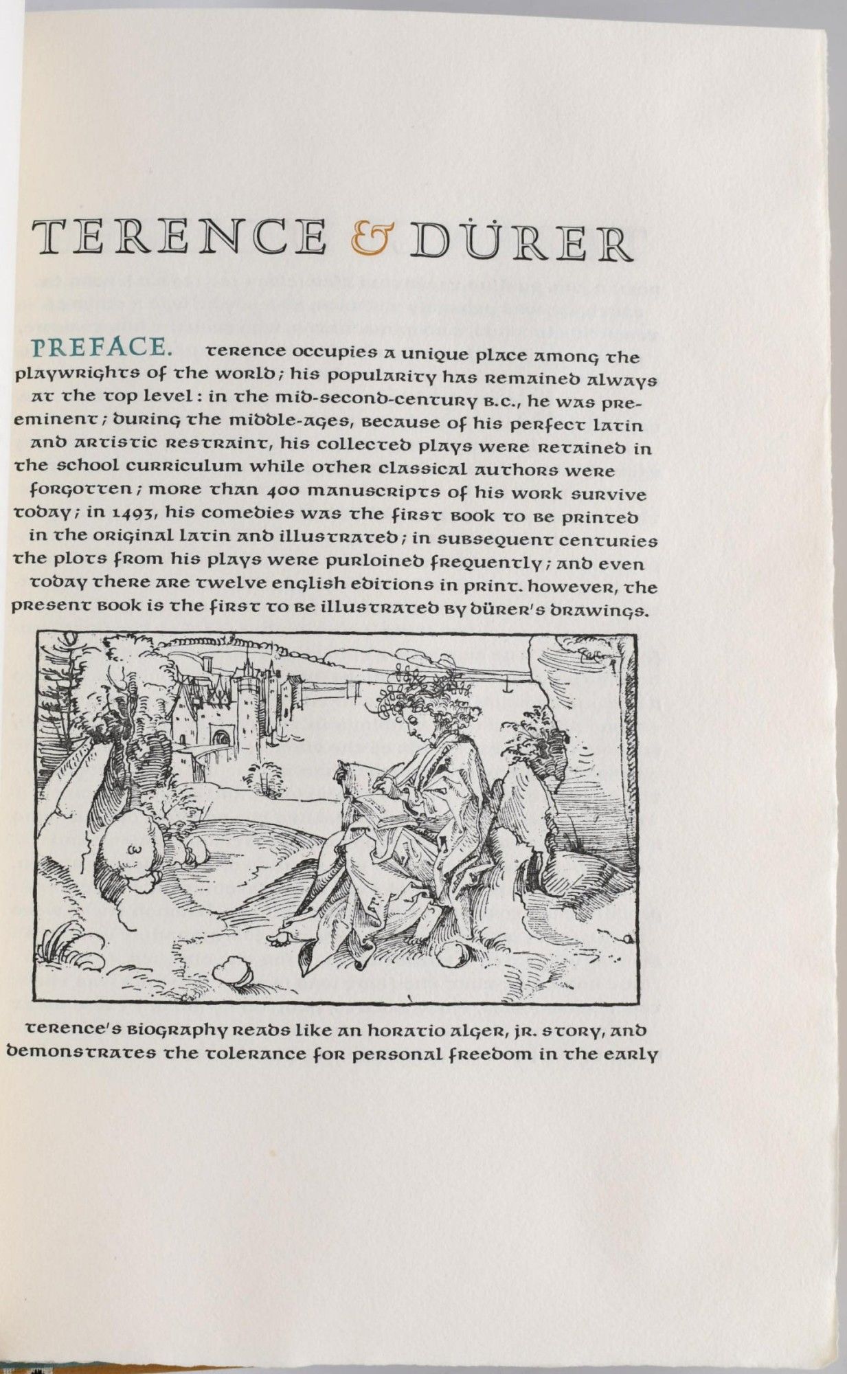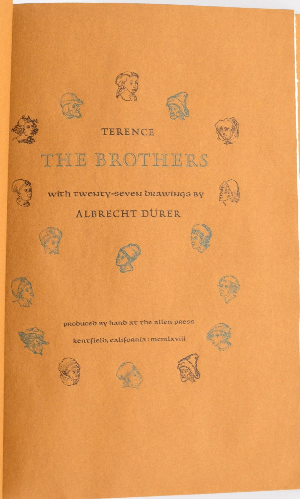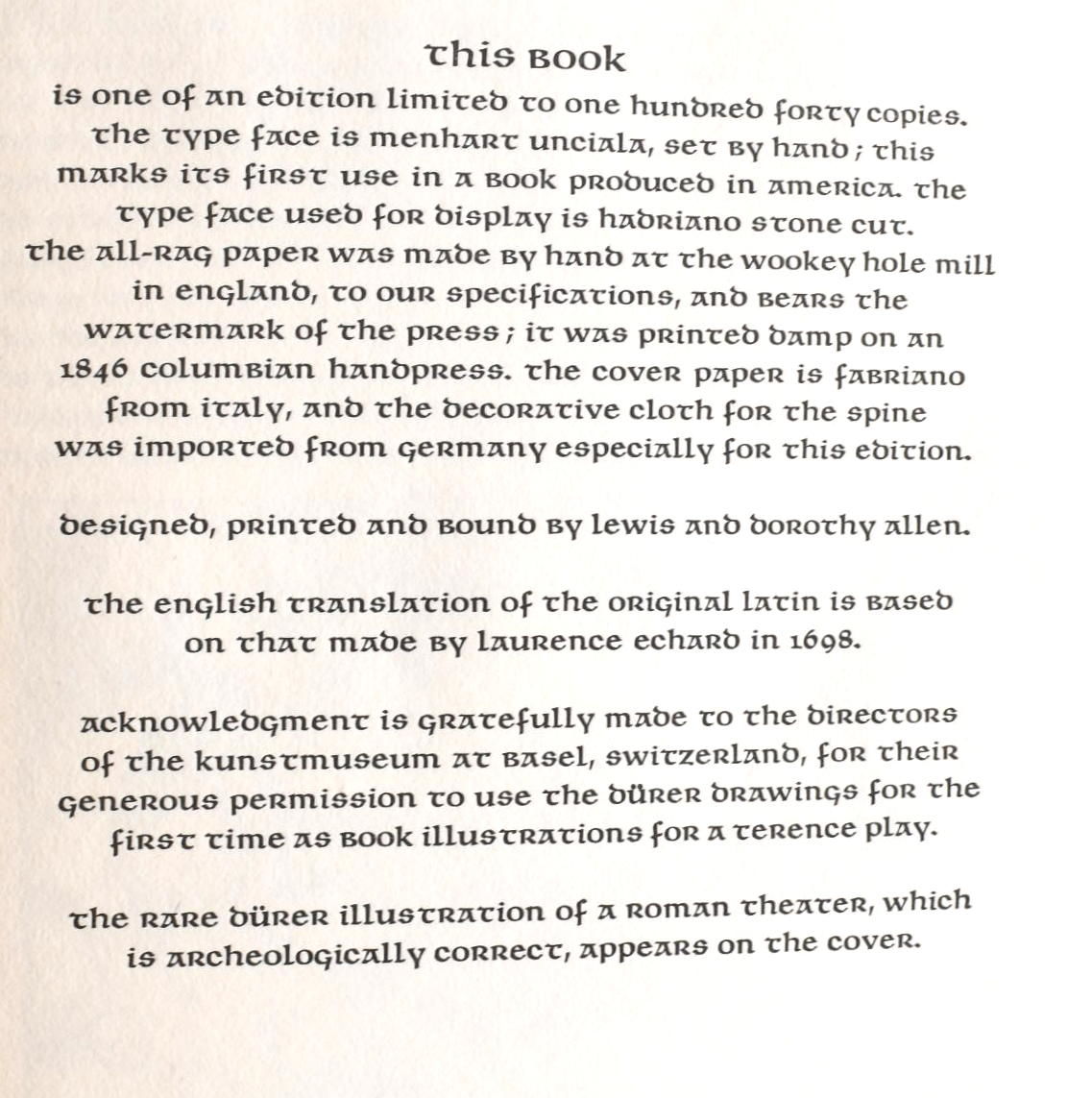 Kentfield, Calif: Produced by hand at the Allen Press, 1968. Near Fine binding. Quarto; in the publisher's printed mustard colored boards backed with woven fabric, with the upper cover printed with a Durer illustration of an ancient theater; [34] leaves, with 27 illustrations taken from drawings by Durer; headers printed in brown with chapter number in teal; housed in a mustard paper covered slipcase which has a trivial amount of sunning; one of 140 copies. Near Fine binding.