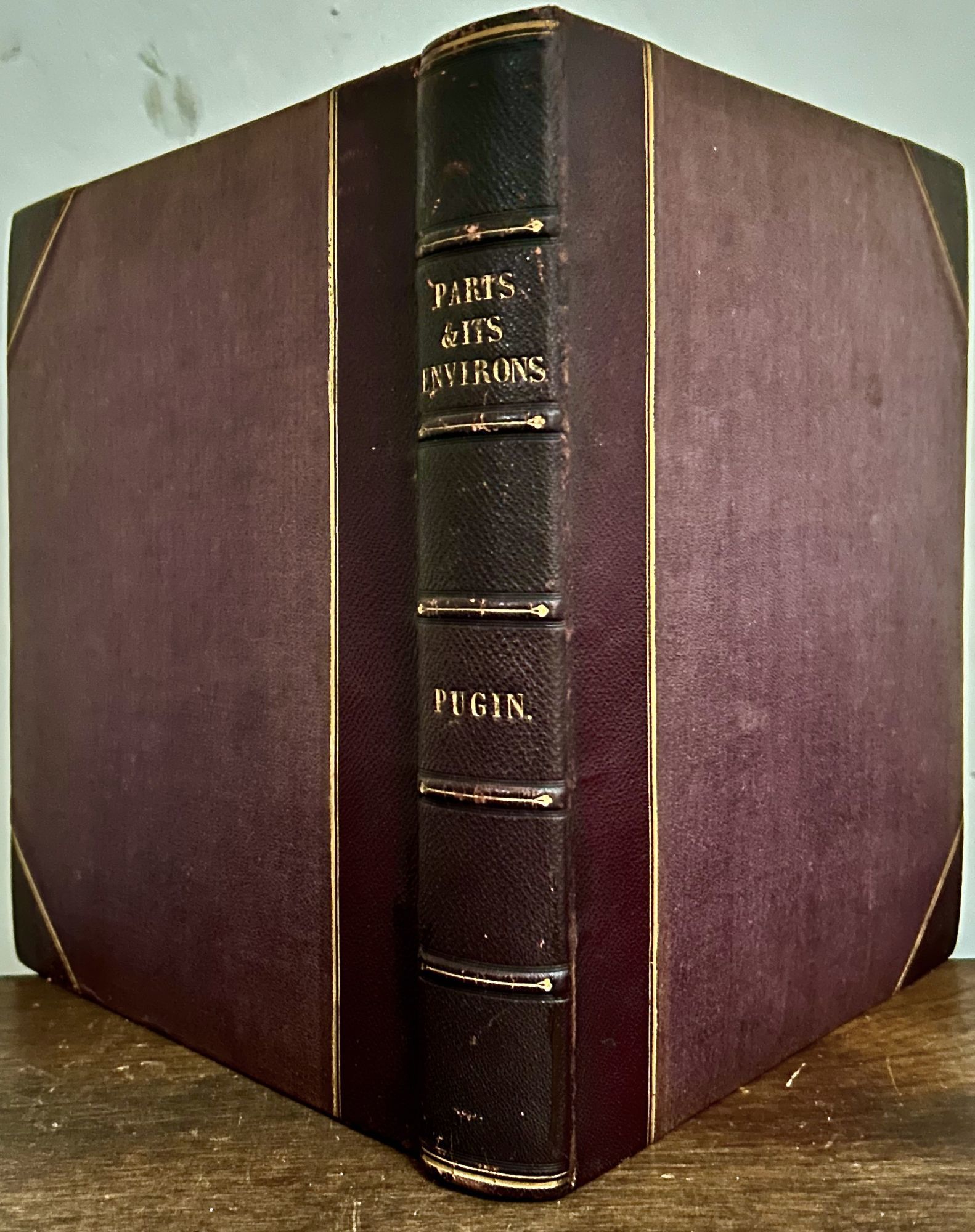 London: Jennings & Chaplin, 1831. Hardcover. Contemporary gilt lettered gilt lined three quarter morocco and dark brown cloth. Teg. Very good/Near fine. Pugin, Augustus Charles. 202 pages. 36 x 28.4 cm. 202 steel engraved views on 101 mounted sheets (India Proofs, each plate with two images) as issued with tissue guards. Published 1829-1931. Topographical and historical descriptions by L.T. Ventouillac. An architectural draughtsman, he worked for Nash for several years before setting out on his own [see: BRYAN Vol.IV, p.166], and was instrumental in reestablishing the Gothic Revival movement in England. Text in English and French. Scattered plate offsetting, with all plates clean and bright. Two volumes in one.
