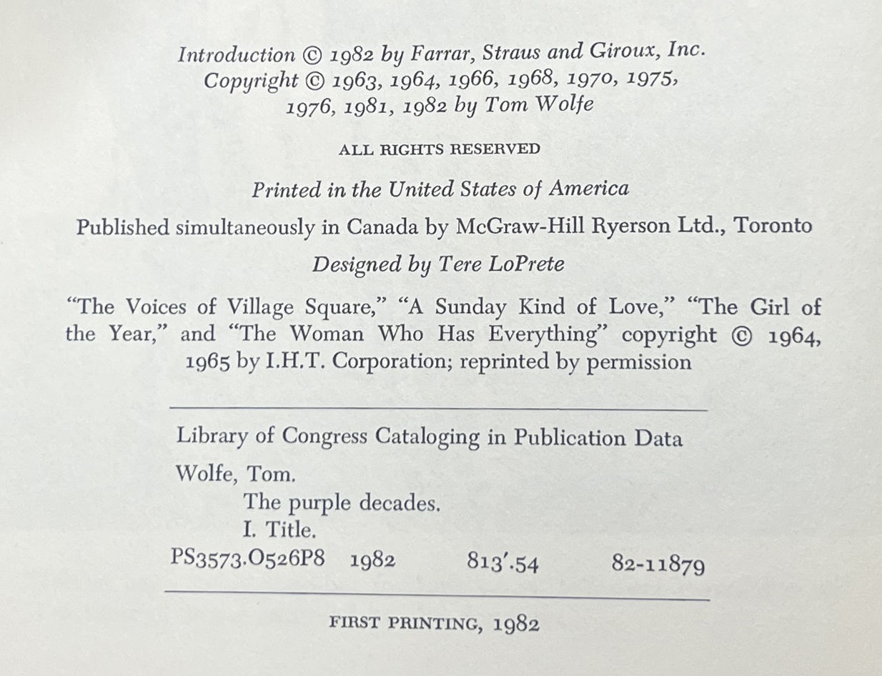 New York: Farrar, Straus and Giroux, 1982. First Edition. Hardcover. Fine/Fine. Introduction by Joe David Bellamy. Selected by Tom Wolfe. Fine in a Fine jacket, unclipped ($17.50), faintly bumped at the top edge. Purple cloth with gilt lettering on the spine. Square and firmly bound, clean internally. A selection of Wolfe's writings from the 1960s and 1970s, including excerpts from Radical Chic and The Right Stuff as well as the entirety of "The Last American Hero," "The Me Decade and the Third Great Awakening," among others.
