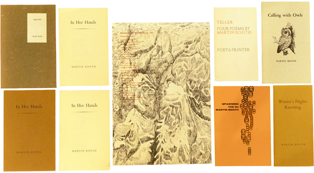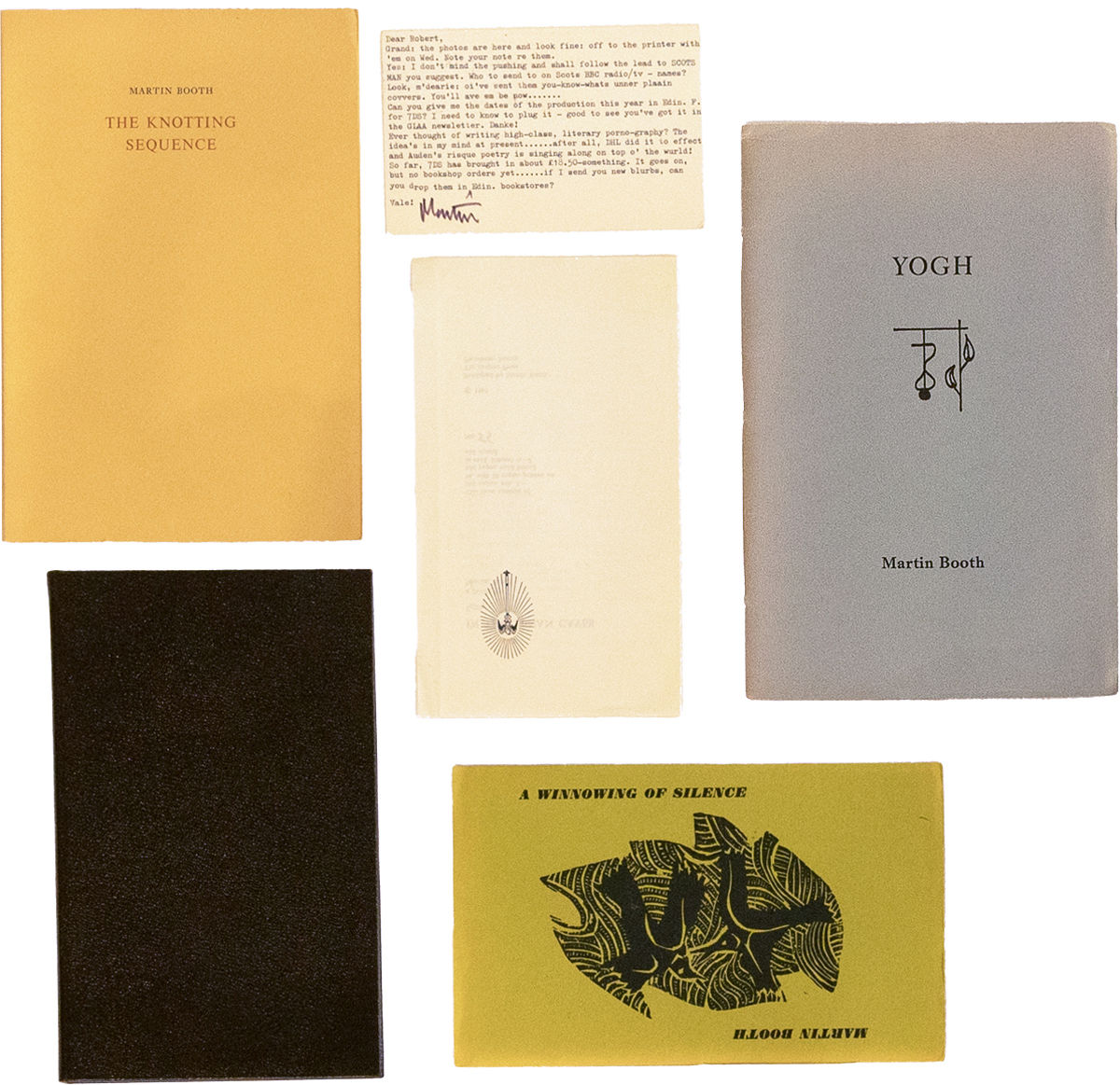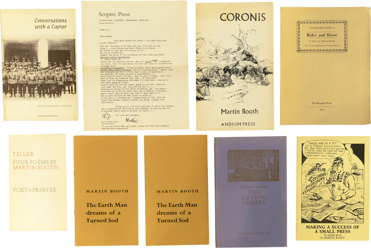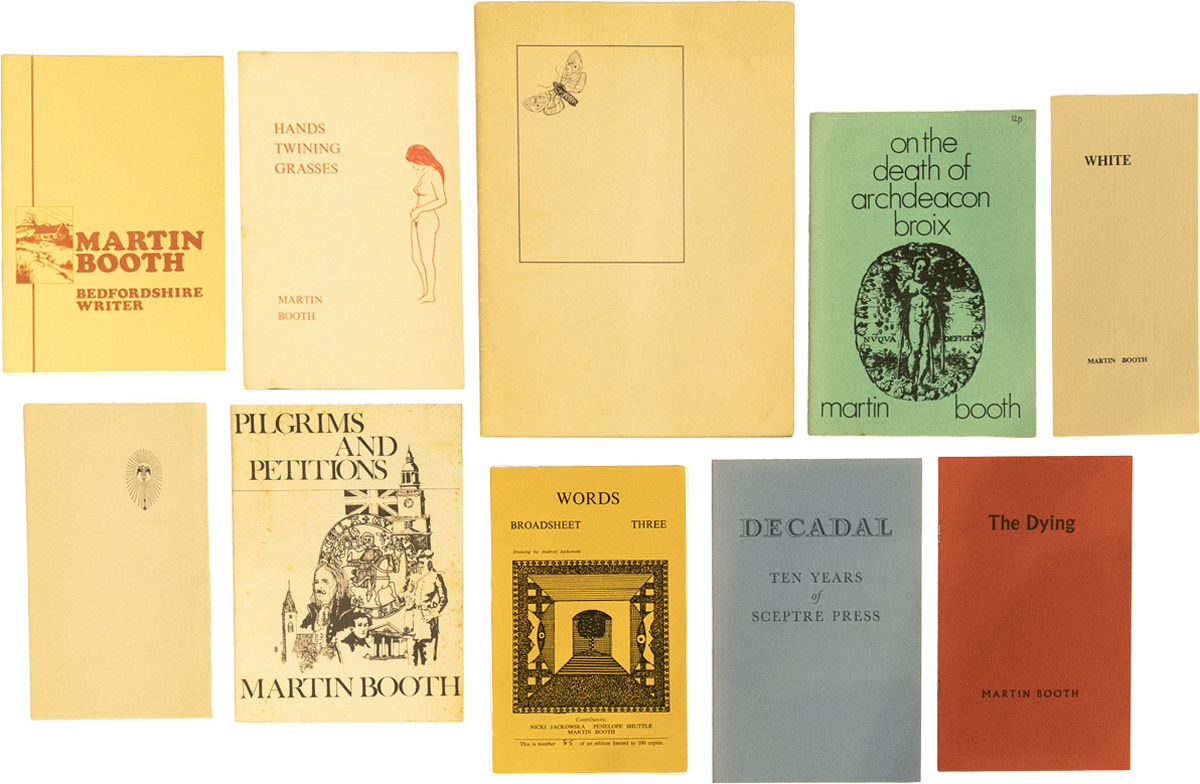[U.K./U.S.]: [various], 1969-1977. First Edition. A significant collection of first editions by this distinguished writer. Chapbooks, cloth book in dustjacket, full leather book, pamphlets, and broadsides. PAPER PENNIES and Other Poems (signed - his rare first book; no.91 of 100); Supplication To The Himalayas. Sceptre Press, 1968 broadside (his second publication, signed by poet and illustrator, broadside no.13 of 50). IN THE YENAN CAVES. 1969, no.55 of 74 numbered. THE BORROWED GULL. 1970, no.19 of 74 numbered. WHITE. 1971, no.84 of 100 numbered. A WINNOWING OF SILENCE. 1971, no.106 of 180 numbered and signed. ONE THE DEATH OF ARCHBISHOP BROIX. 1971. THE CRYING EMBERS, Fuller D'arch Smith, 1971,1st binding, first collected. WORDS Broadsheet three, no.85 of 100 numbered. PILGRIMS AND PETITIONS. 1971. TELLER. 1972. (unsigned). TELLER. 1973. Inscribed to Robert Nye. CORONIS. 1973. Review copy with prospectus. IN HER HANDS [1973], no.31 of 50 numbered and signed, with inscription to Robert Nye. HANDS TWINING GRASSES. 1974. no.65 of 150 numbered copies; inscribed to Robert Nye. SPAWNING THE OS. 1974, no.201 of 350 numbered copies. YOGH. 1974, no.72 of 100 numbered copies, with poet's inscription and signature. BREVITIES (Cid Corman's design at Elizabeth Press). [1974], one of 300 copies; inscribed to Robert Nye. RIDER AND HORSE. 1976. THE KNOTTING SEQUENCE. [1977]. One of 500. THE EARTH MAN DREAMS OF A TURNED SOD. [1978], no.35 of 50 signed and numbered & no.140 of 150 numbered (of 200). THE DYING. [1978], no.40 of 50 numbered and signed. WINTER'S NIGHT [1979], no.49 of 50 numbered and signed; additional issue sent as holiday greeting. DECADAL: Ten Years of Sceptre Press. [1979]. Edited by Booth, no.4 of 300 copies; specially signed. CALLING WITH OWLS. [1979], no.2 of 100 numbered and signed. THE DEVIL'S WINE. 1980. Full leather, no.7 of 50 copies, signed. MARTIN BOOTH: Bedfordshire Writer. IN HER HANDS, 1973, pamphlets no.67 & no.105 of 150. CONVERSATIONS WITH A CAPTOR by Jean Overton Fuller & forward by Booth [1973], w/ Booth's inscription to Robert Nye. MAKING A SUCCESS OF A SMALL PRESS. Most published in the U.K., some U.S.. With FOUR TYPED LETTERS SIGNED AND ONE TYPED POSTCARD SIGNED to author Robert Nye dated from Dec. 1973, to March 1974. Good publishing, writing content having to do with reviewing, sending books off to London publishers, needing a job, paying the printer, suggesting a book of "porn-ography", etc. Nye, like Booth a prolific novelist and poet, was the poetry editor of The Scotsman and there are references made to it.