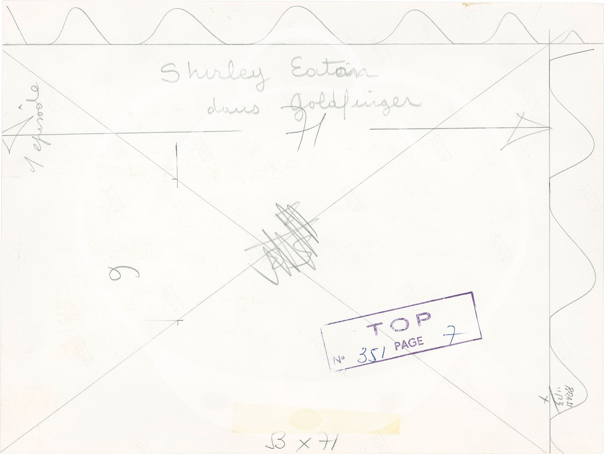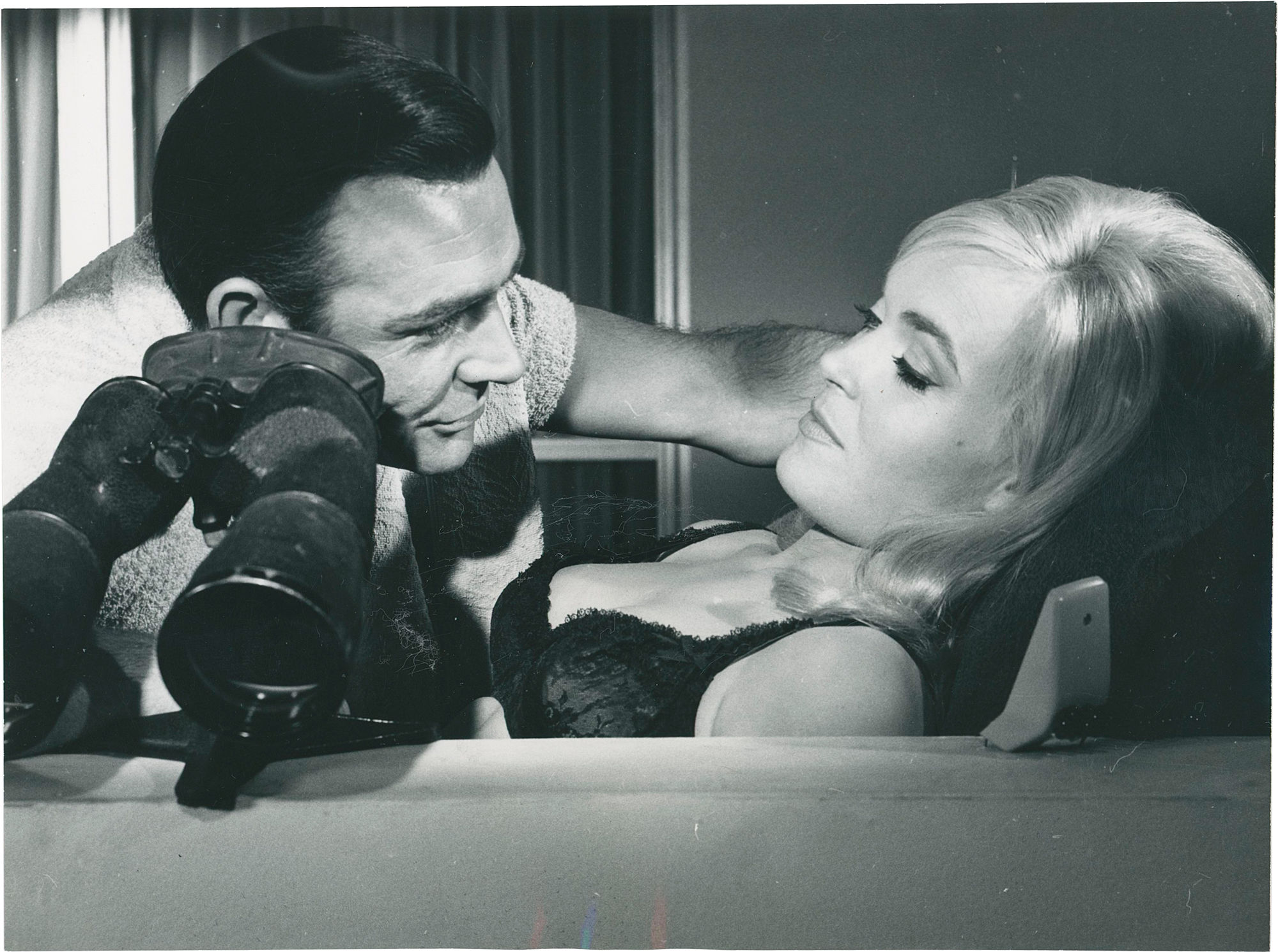 N.p.: N.p., 1964. Two vintage borderless reference photographs from the 1964 film, both showing Sean Connery and Shirley Eaton. With the stamps of Top magazine on the verso, along with layout annotations in manuscript pencil.