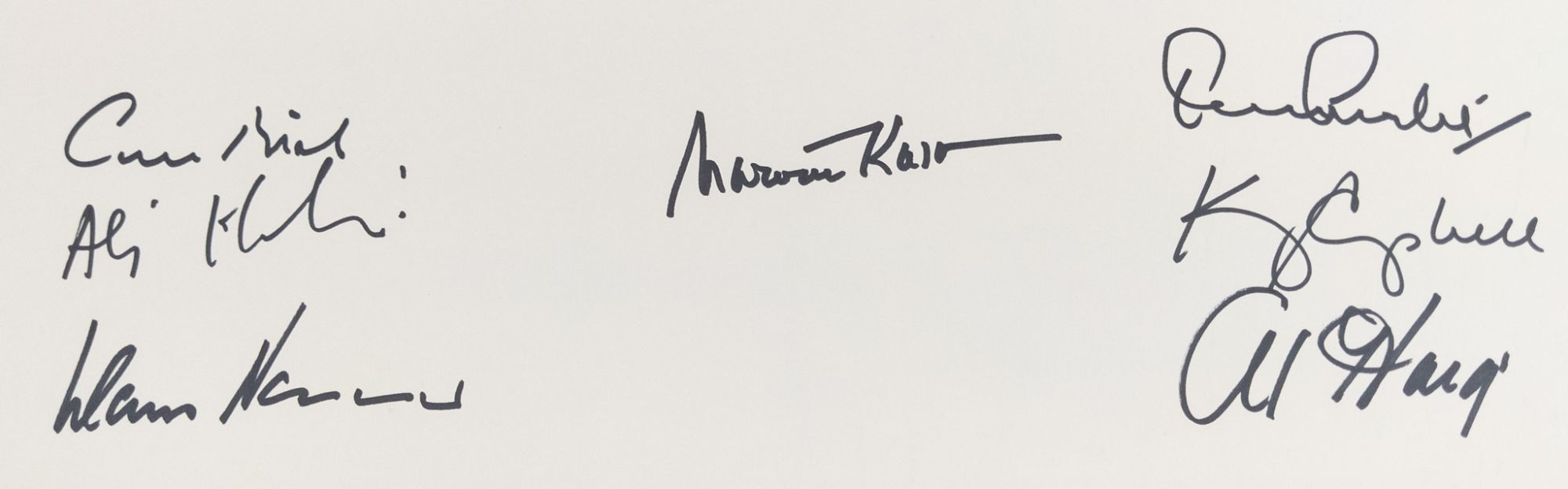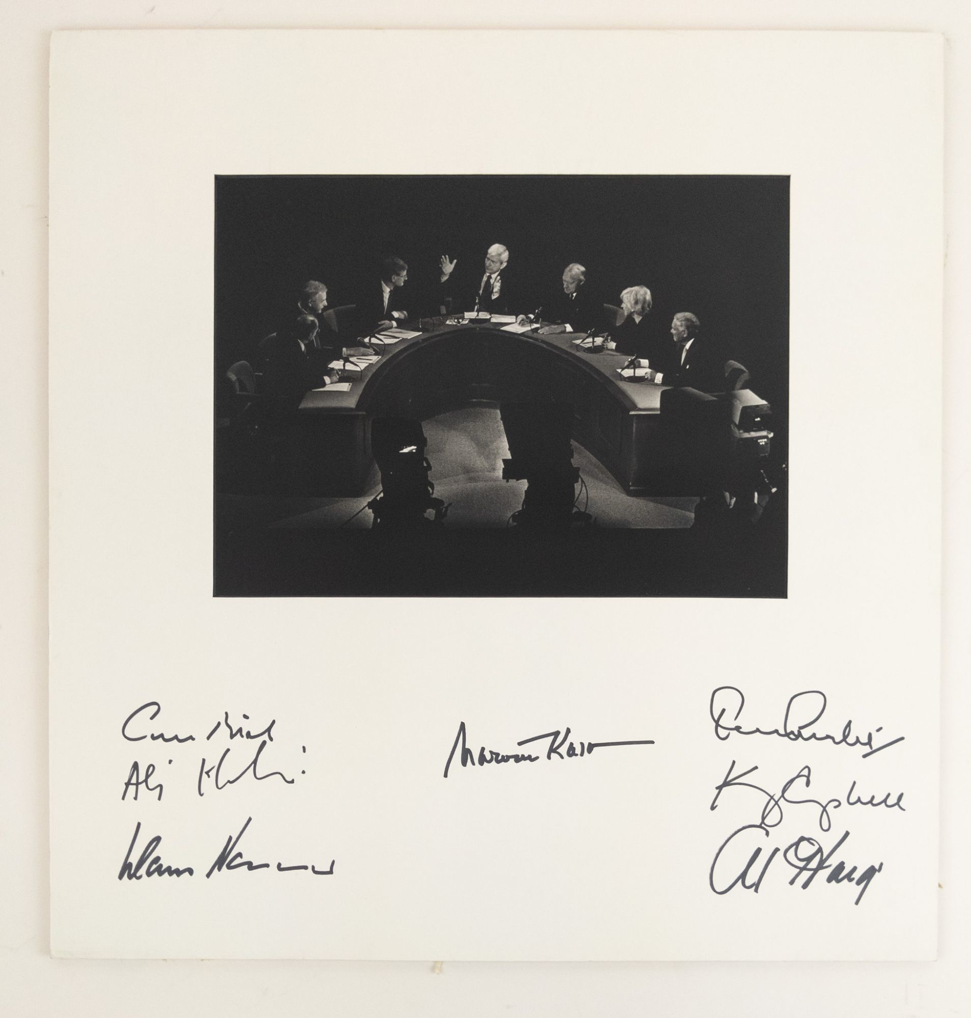 Atlanta, 2001. Black and white photograph of 'A Summit on Europe', hosted by Southern Center for International Studies (SCIS) on 04-06-2001. Signed by: Carl Bildt (Former Prime Minister of Sweden), Kim Campbell (Former Prime Minister of Canada), Alexander Haig (Former U.S. Secretary of State), Klaus Naumann (Former German Chairman of the North Atlantic Military Committee), Andrzej Olechowski (Former Polish Minister of Foreign Affairs), Ali Mazrui (Kenyan-born American academic and political writer), and Marvin Kalb.. Dimensions: w 18.5 in x h 19.5 in. PW Consignment. TW035u. 1378837. Special Collections.