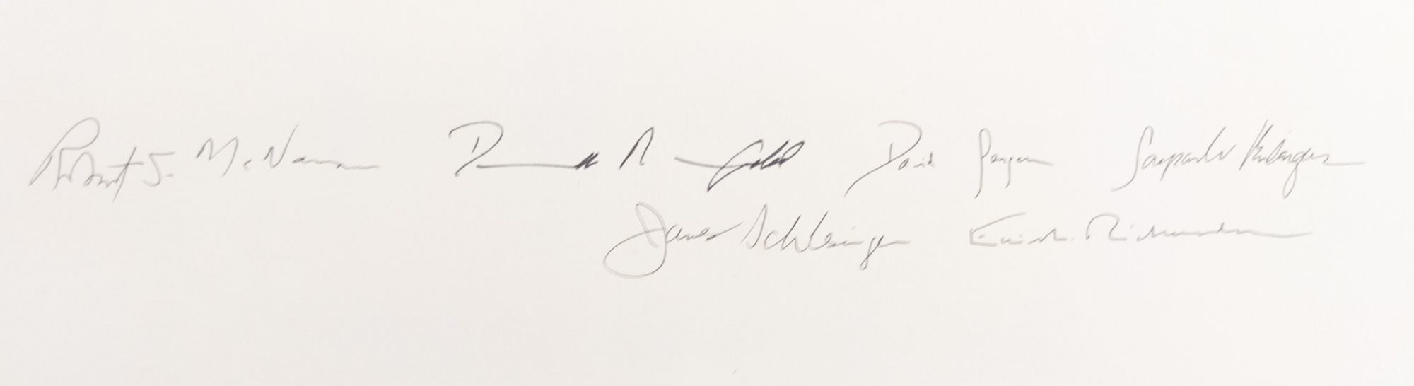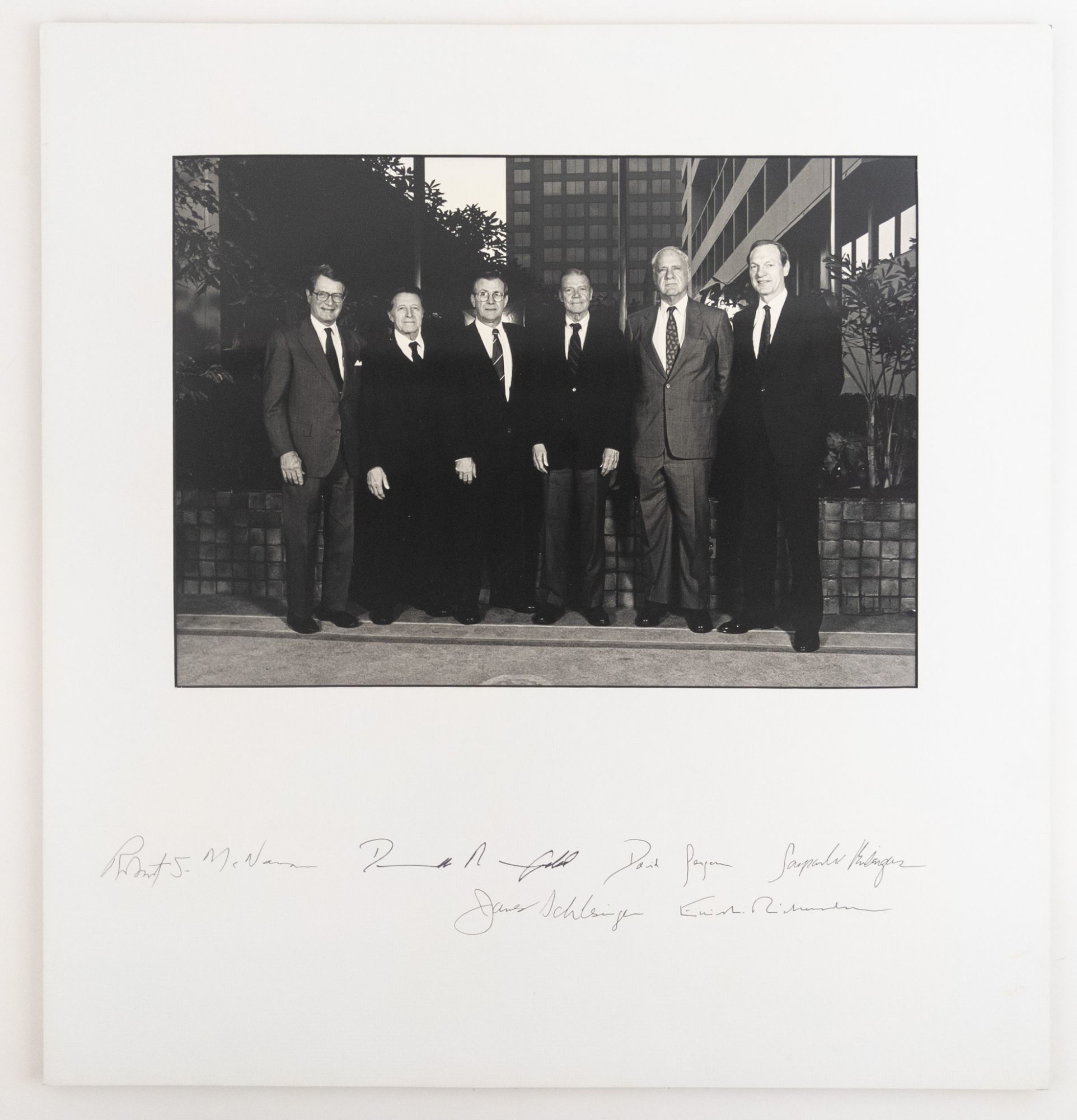 1991. Black and white photograph of 'The Fifth Annual Report of the Secretaries of Defense', hosted by Southern Center for International Studies (SCIS) on 12-13-1991. Signed by: Robert S. McNamara, Donald Rumsfeld, David Gergen, Caspar Weinberger, James Schlesinger, and Elliot Richardson. Dimensions: w 18.5 in x h 19.5 in. PW Consignment. TW055u. 1378849. Special Collections.