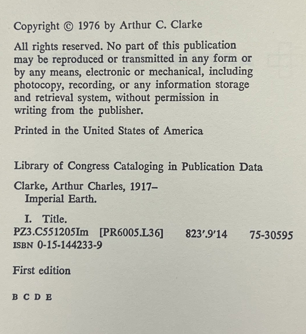 New York: Harcourt Brace Jovanovich, 1976. First Edition. Hardcover. Near Fine/Near Fine. Near Fine in a Near Fine jacket, unclipped ($7.95), bumped at the edges. Quarter black cloth with orange paper on the boards. Firmly bound with a forward lean, clean internally. Clarke's science fiction novel of a diplomatic journey from Titan to Earth.