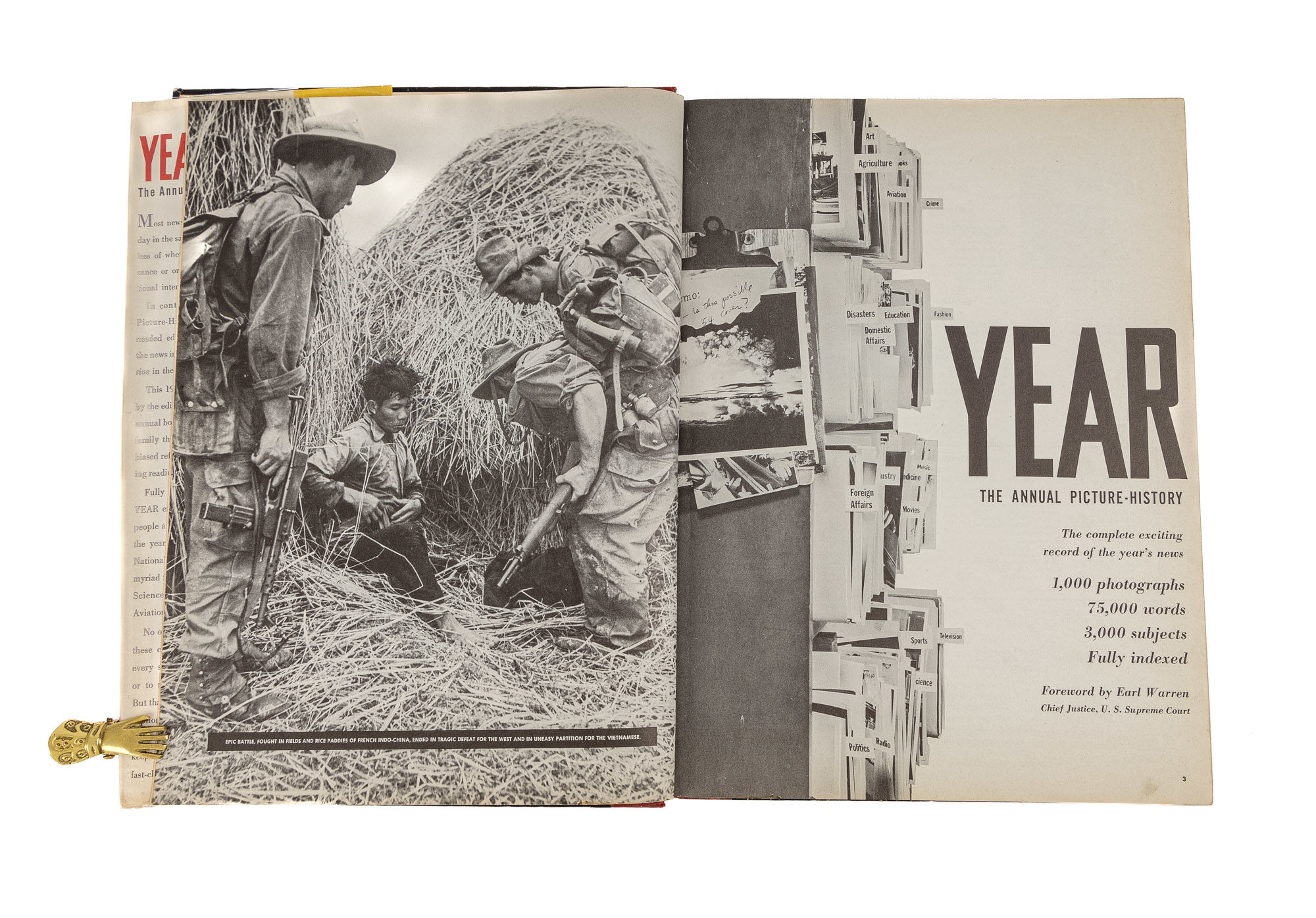 1954. Ward, Baldwin H. Editor. Warren, Earl, Foreword. Year: The Annual Picture-History, The Complete Exciting Record of the Year's News [1954]. [Los Angeles and New York: Year Incorporated/Simon and Shuster, 1954]. 192 pp. "1,000 photographs, 75,000 words, 3,000 subjects. Fully indexed." Folio (14" x 10-1/2"). Moderately edgeworn hardcover in moderately edgeworn and lightly soiled dust jacket, a few marks and finger smudges to endleaves. $20.