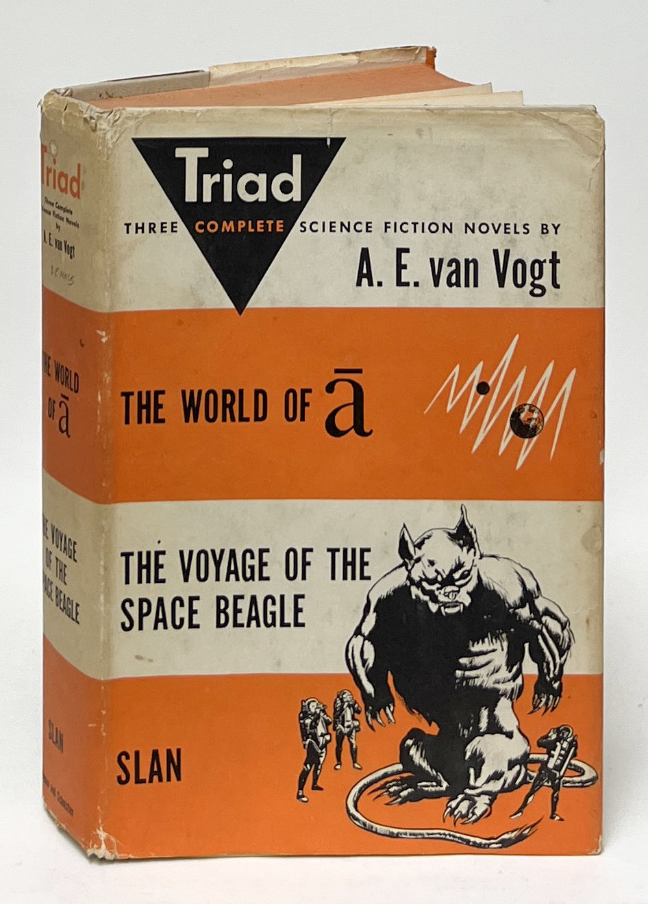 New York: Simon and Schuster, 1951. Book Club Edition. Hardcover. Good/Good. Good in a Good jacket, generally soiled, a few short tears and chips. Beige boards, bumped at the edges. Square and firmly bound with an orange top stain, stained at the edges, former owner's name inside the front board, clean otherwise. Three of van Vogt's most popular novels collected into one volume.