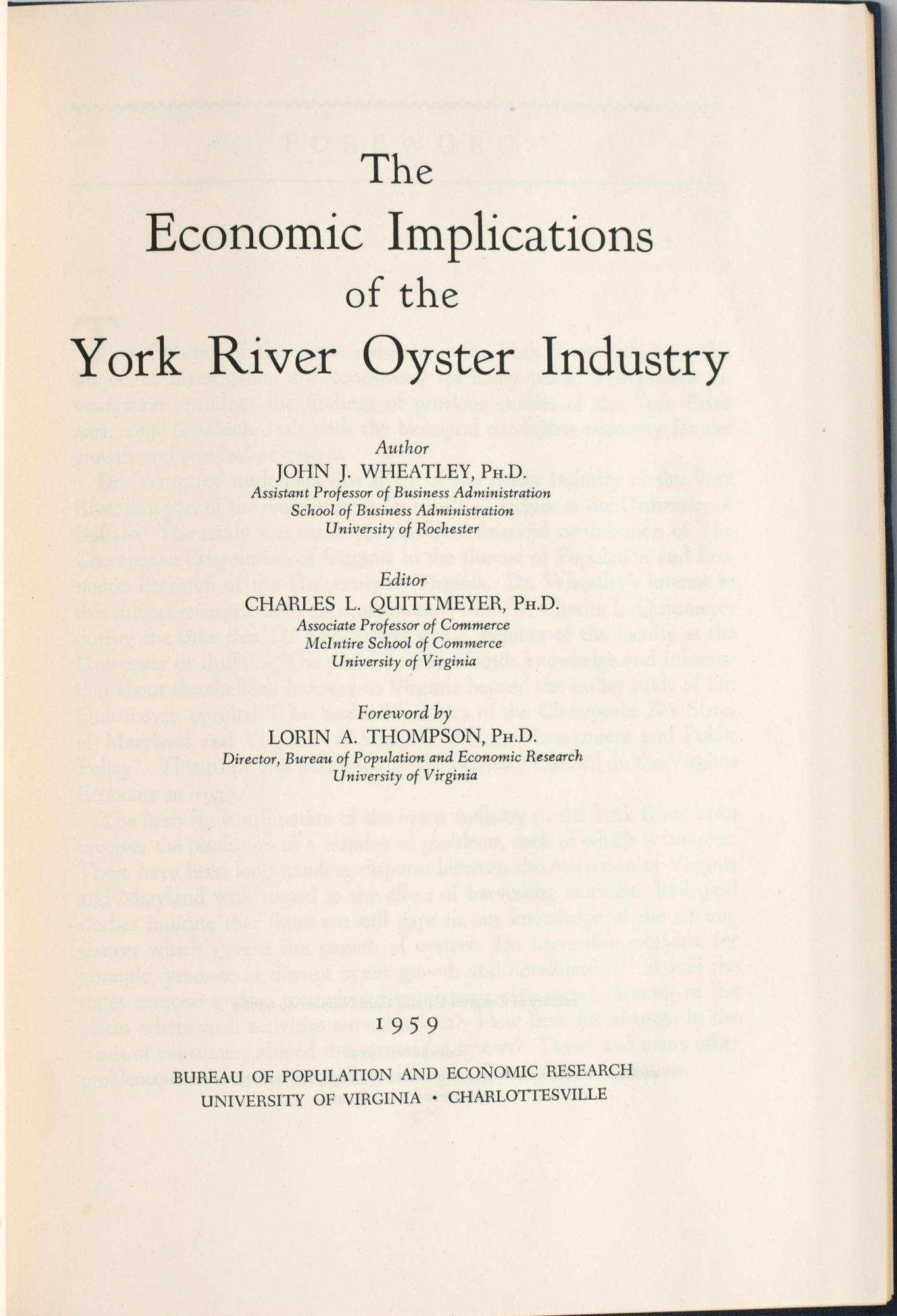 [VIRGINIA] [MARITIME] THE ECONOMIC IMPLICATIONS OF THE YORK RIVER OYSTER INDUSTRY