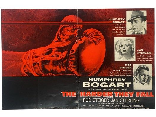 S.N, 1956. Poster. Very Good. Edge wear. 1956 Poster. 18 1/2 x 12 1/4 inches. Single-fold color movie poster. Broke and without work, newspaper reporter Eddie Willis (Humphrey Bogart) agrees to work for the corrupt boxing promoter Nick Benko (Rod Steiger) to help hype his new boxer, Toro Moreno (Mike Lane). While Toro is beastly in appearance, he has no actual boxing talent, and all his fights are fixed. When Toro gets a shot at the title against the brutal Buddy Brannen (Max Baer), Willis is faced with the tough decision of whether or not to tell Toro that his entire career is a sham.