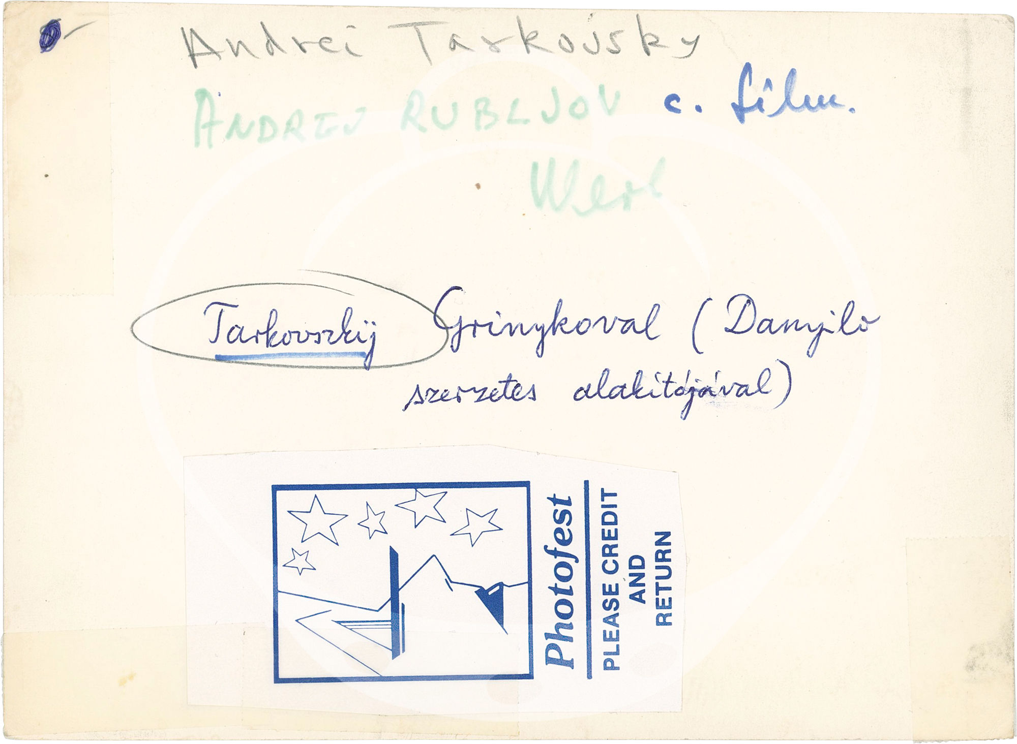 N.p.: N.p., 1966. Vintage borderless double weight reference photograph of director Andrei Tarkovsky talking with actor Nikolay Grinko on the set of the 1966 film. Annotations in manuscript ink and pencil on the verso, along with a Photofest label.