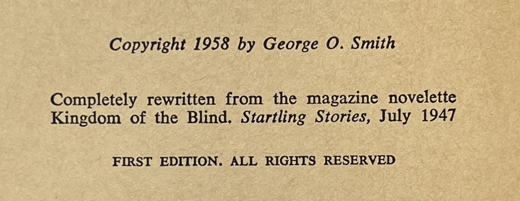 New York: Gnome Press, Inc, 1958. First Edition. Hardcover. Near Fine/Very Good. Near Fine in a Very Good jacket, unclipped ($3.00), generally rubbed, some soiling and rippling throughout. Grey boards with red ink lettering on the spine. Square and firmly bound, clean internally. Smith's science fiction mystery about the mental degradation and recovery an atomic physicist.