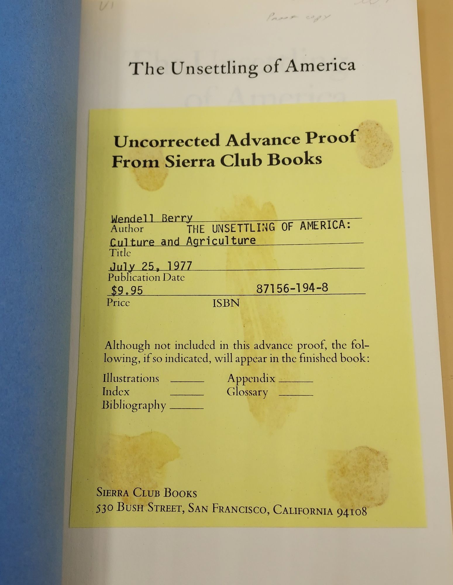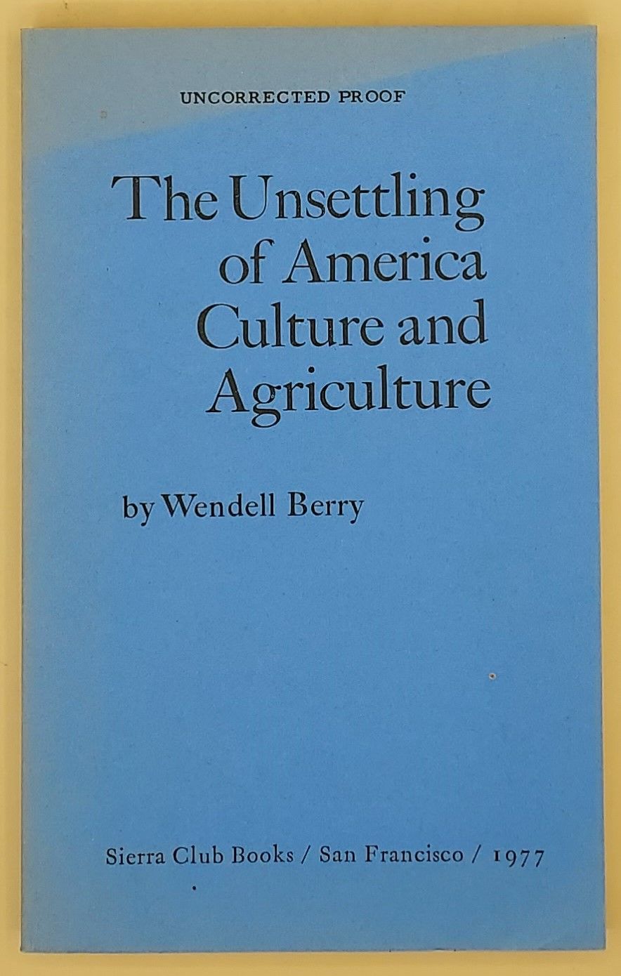 San Francisco: Sierra Club Books, 1977. Uncorrected proof. Paperback. Very Good. SIGNED. 207pp. Octavo [21 cm] Blue printed wraps. Publisher's slip mounted to the half title page, with some glue staining. Fading to the spine and upper extremities of the wraps. Signed by Wendell Berry on the title page.