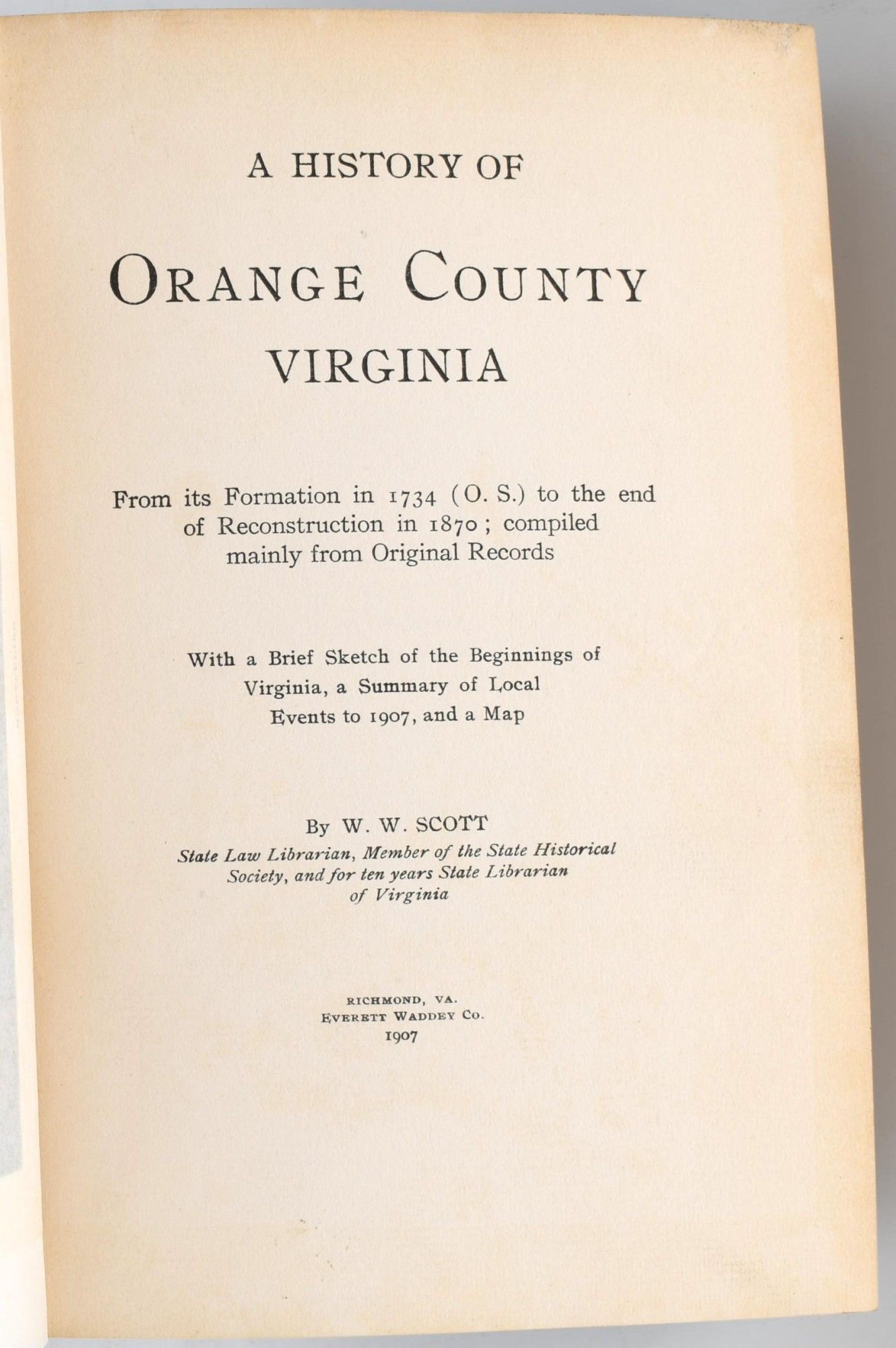 [VIRGINIA] A HISTORY OF ORANGE COUNTY VIRGINIA, FROM ITS FORMATION IN 1734 (O. S.) TO THE END OF RECONSTRUCTION IN 1870; COMPILED MAINLY FROM ORIGINAL RECORDS WITH A BRIEF SKETCH OF THE BEGINNINGS OF VIRGINIA, A SUMMARY OF LOCAL EVENTS TO 1907, AND A MAP