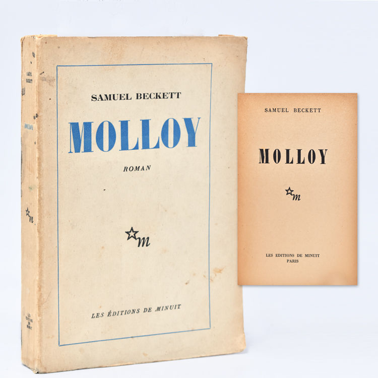 Paris: Les editions de Minuit, 1951. First edition, trade issue (one of 3000 copies, after 50 numbered copies of the édition de tête and 500 on alfa). 272, [2, blank], [2, imprint] pp. 1 vols. 8vo. White wrappers printed in black and blue. Spine faintly toned, text block with usual browning, otherwise very good plus. First edition, trade issue (one of 3000 copies, after 50 numbered copies of the édition de tête and 500 on alfa). 272, [2, blank], [2, imprint] pp. 1 vols. 8vo. Choice example of Beckett's darkly comic novel, originally composed and published in French, and published in English translation in 1955.