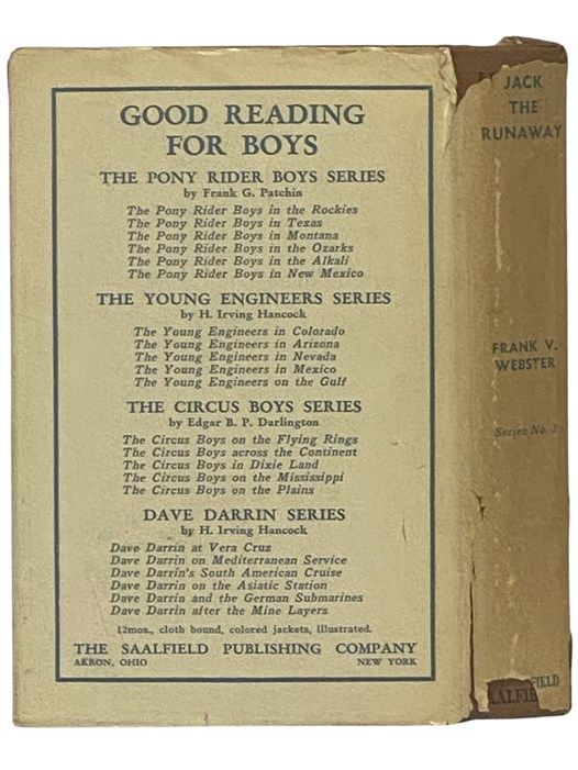 Akron, Ohio/New York: The Saalfield Publishing Company, 1937. Hard Cover. Good/Good. 0x0x0. Multiple chips and tears to jacket. Pages toned. 1937 Hard Cover. 201 pp. Boys' adventure fiction about Jack Allen, a boy who runs away to travel with the circus.