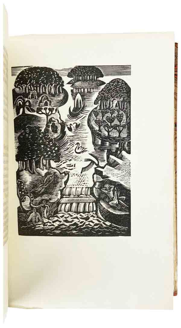 Berkshire: The Golden Cockerel Press, 1928. Very Good. [Berkshire, England]: The Golden Cockerel Press, 1928. First U.K. Edition, Limited to 400 copies of which this is no. 26. Octavo (22.8cm); 34pp. 3 plates including frontispiece. No dust jacket. Marbled paper quarter bound with blue cloth along the spine. Top edge gilt, all other edges deckled. Includes gilt stamped title and author on spine as well. Slight bowing on front board and scuffing along head and tail edges of spine and margins of front cover but otherwise Very Good. Damp staining to boards bleeding into bottom gutter of terminals. Pages slightly darkened along the fore edge but otherwise unmarked. All wood-engravings, including the frontispiece and the colophon rooster, are protected with full-page tissue guards.
