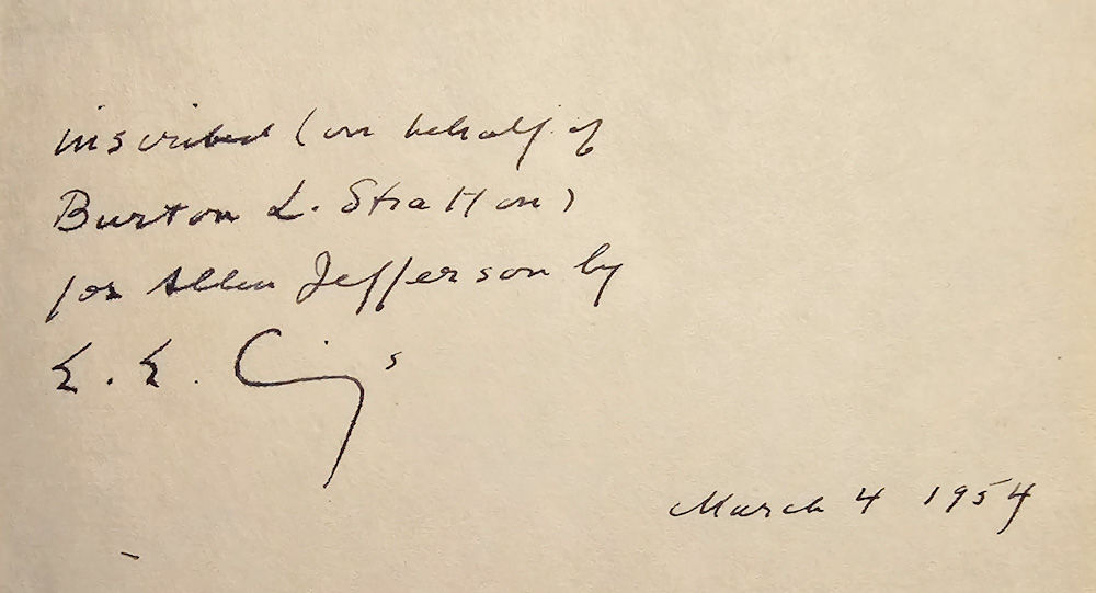 Cambridge: Harvard University Press, 1953. First Edition. Hardcover. Fine, bright copy lacking the uncommon dustwrapper. Copy #31 of 350 of these lectures containing much poetry SIGNED by the poet on the limitation page. In addition this copy is INSCRIBED and SIGNED by the poet on the front endpaper: "inscribed (on behalf of/Burton L. Stratton)/for Allen Jefferson by/E. E. Cummings/March 4, 1954." Stratton is credited as the book's typography designer on the copyright page.
