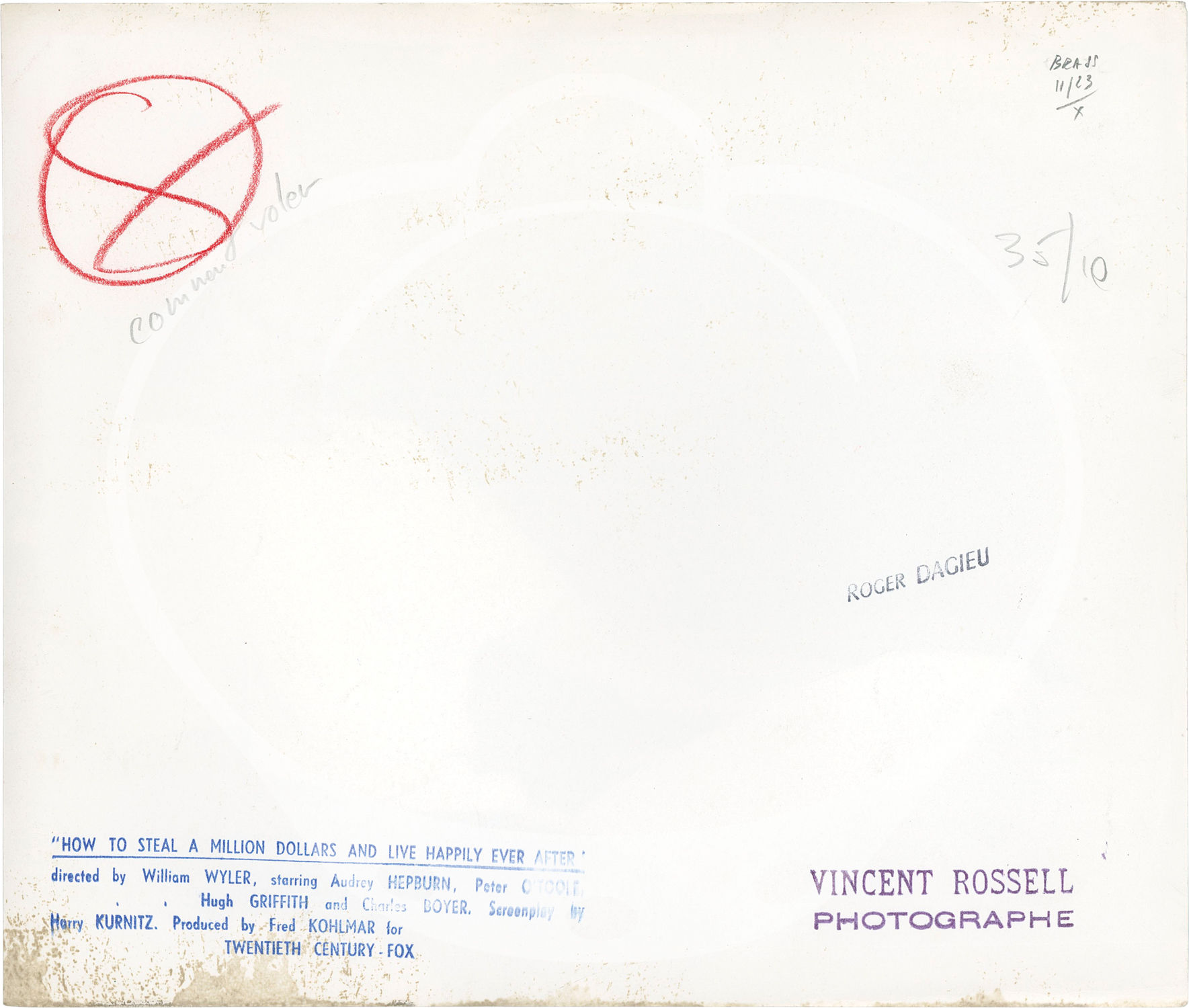 Los Angeles: Twentieth Century-Fox, 1965. Vintage borderless reference photograph from the 1965 film, showing actress Audrey Hepburn. Twentieth Century-Fox release stamp, provenance stamp, and the stamp of photographer Vincent Rossell on the verso.
