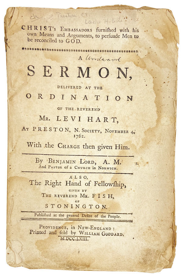 Christ's Embassadors Furnished with His Own Means and Arguments, to Persuade Men to be Reconciled to GOD. A Sermon, Delivered at the Ordination of the Reverend Mr. Levi Hart, at Preston, N. Society, November 4, 1762. With the Charge then given him