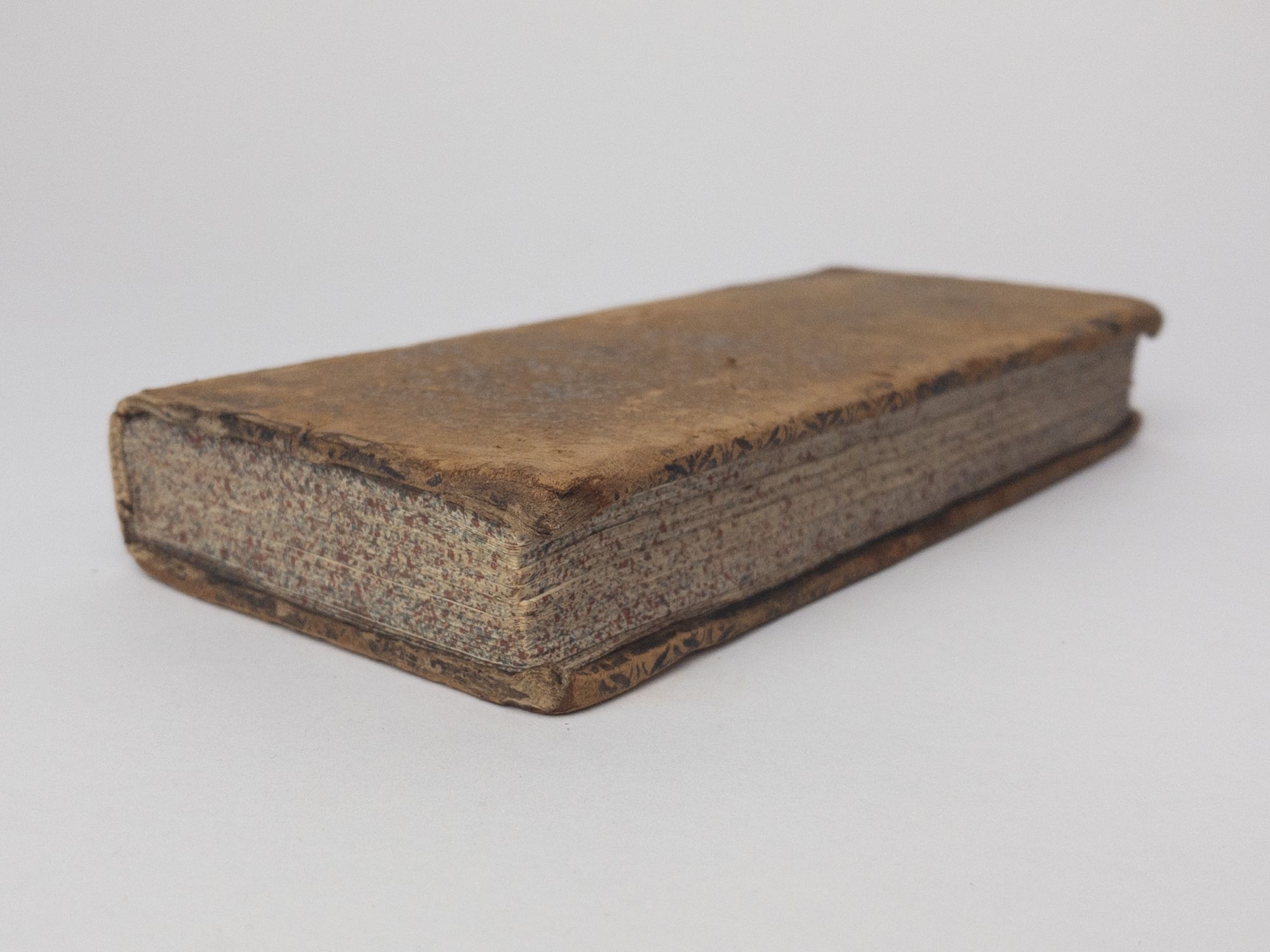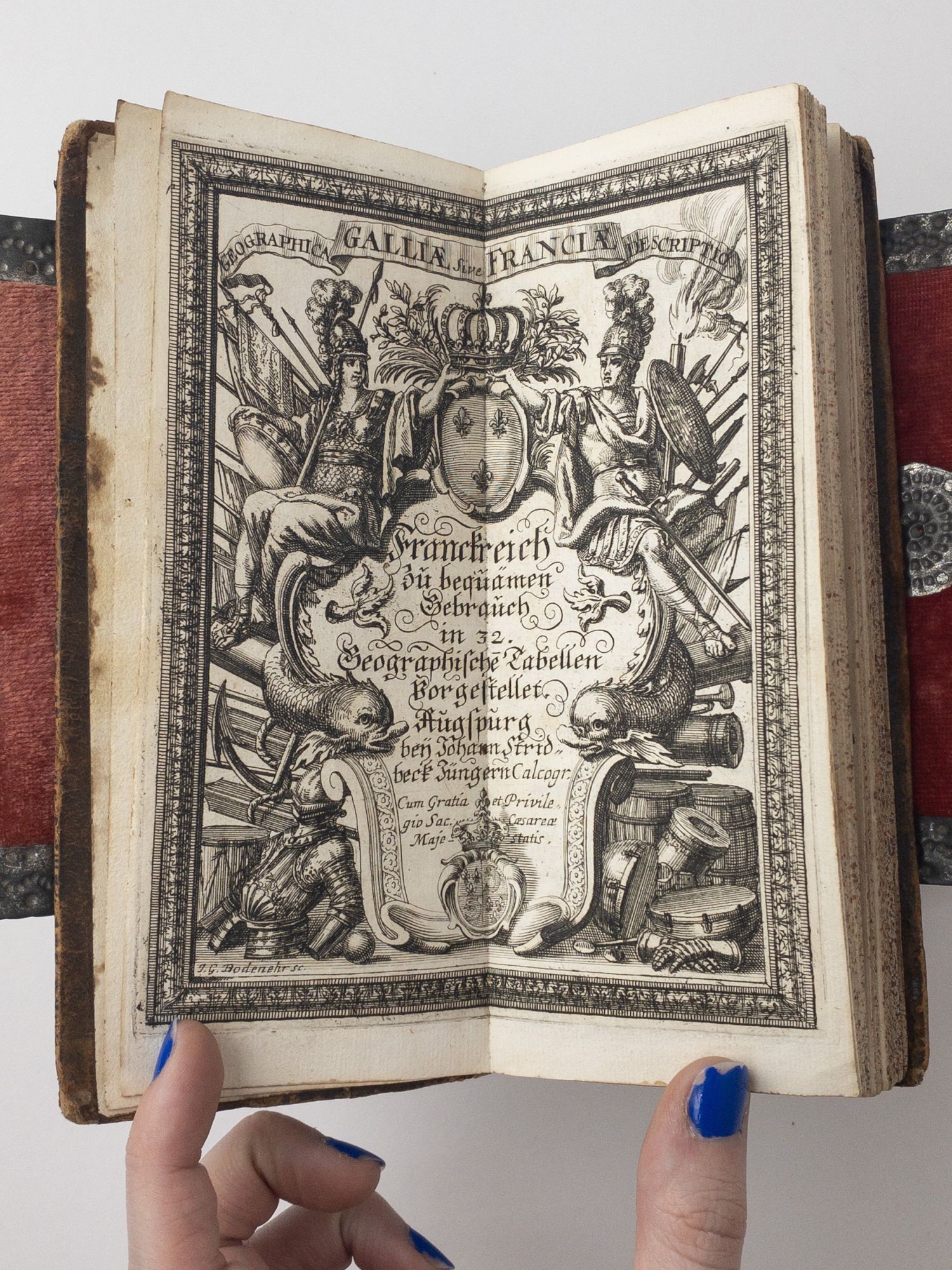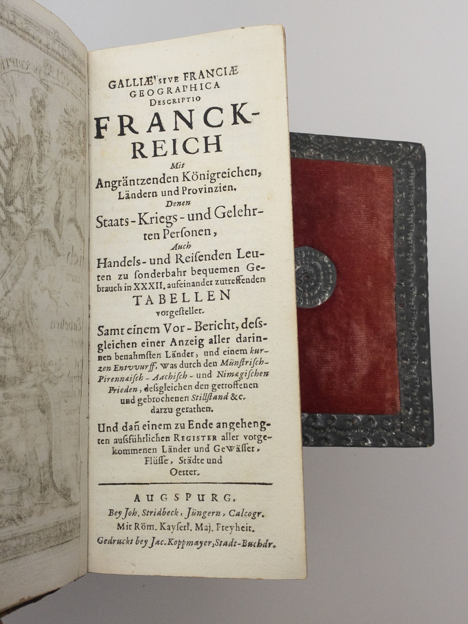 Johann Stridbeck: Augspurg [Augsburg], [c. 1695]. Hardcover. Narrow Octavo, 127, [1] pages. Bound in full contemporary leather with paneled spine. In Very Good minus condition. Scuffing to leather boards. Cracking to spine, with some of textblock exposed. Edges of textblock dyed red and blue. With engraved and letterpress title pages. Worming present from front pastedown to recto of engraved title page, plus scattered at interior tail hinge. Features 34 fold-out engraved maps plus a fold-out engraved scale. Text in German. Shelved in Case 9. "Johann Stridbeck the Elder was the first printmaker and publisher in Augsburg who specialised in maps and topography." [Hollstein]. 1379425. Shelved Dupont Bookstore.