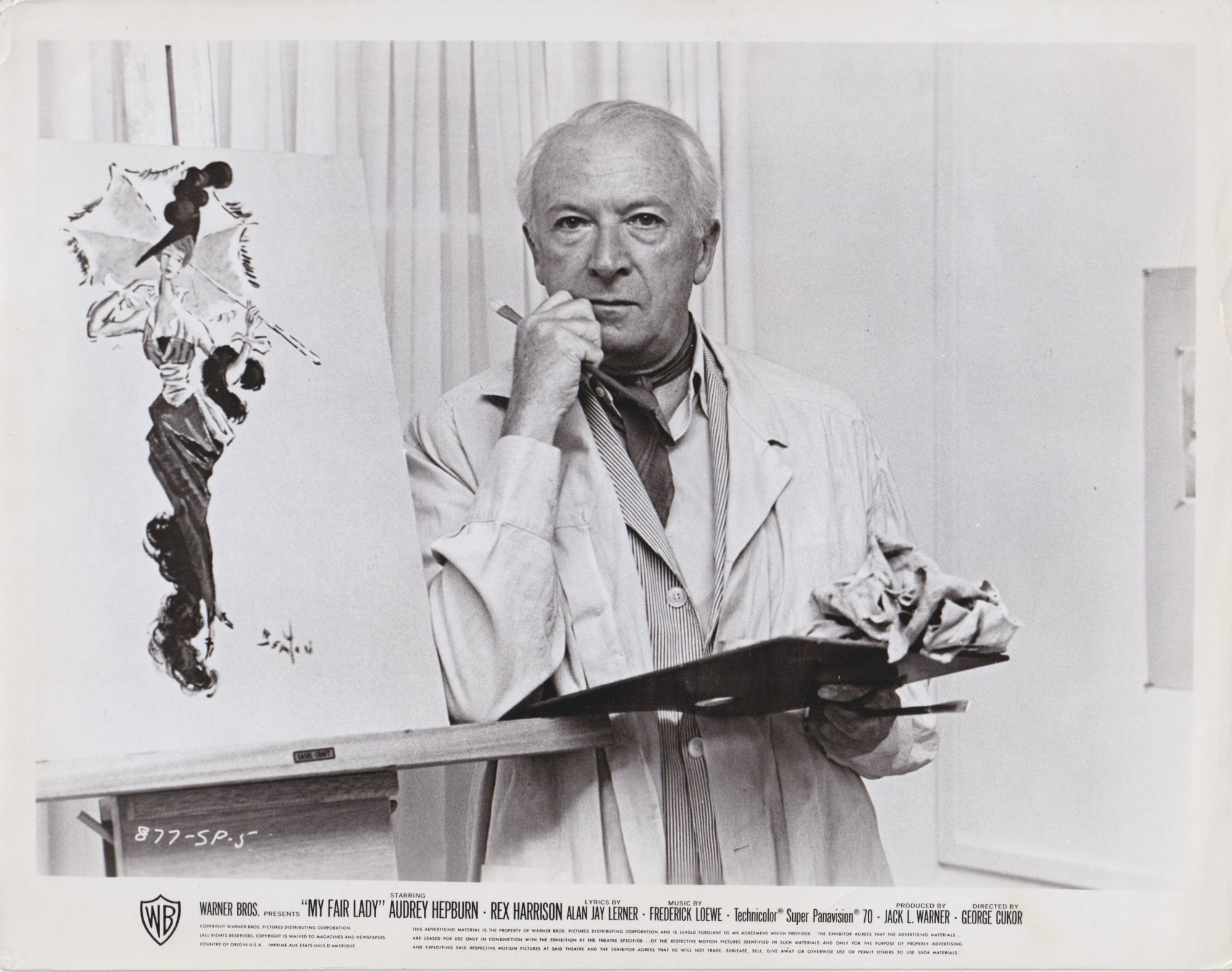 Burbank, CA: Warner Brothers, 1964. Vintage studio still photograph of designer and photographer Cecil Beaton standing next to his costume design illustration for the 1964 film. Annotations in manuscript ink on the verso.