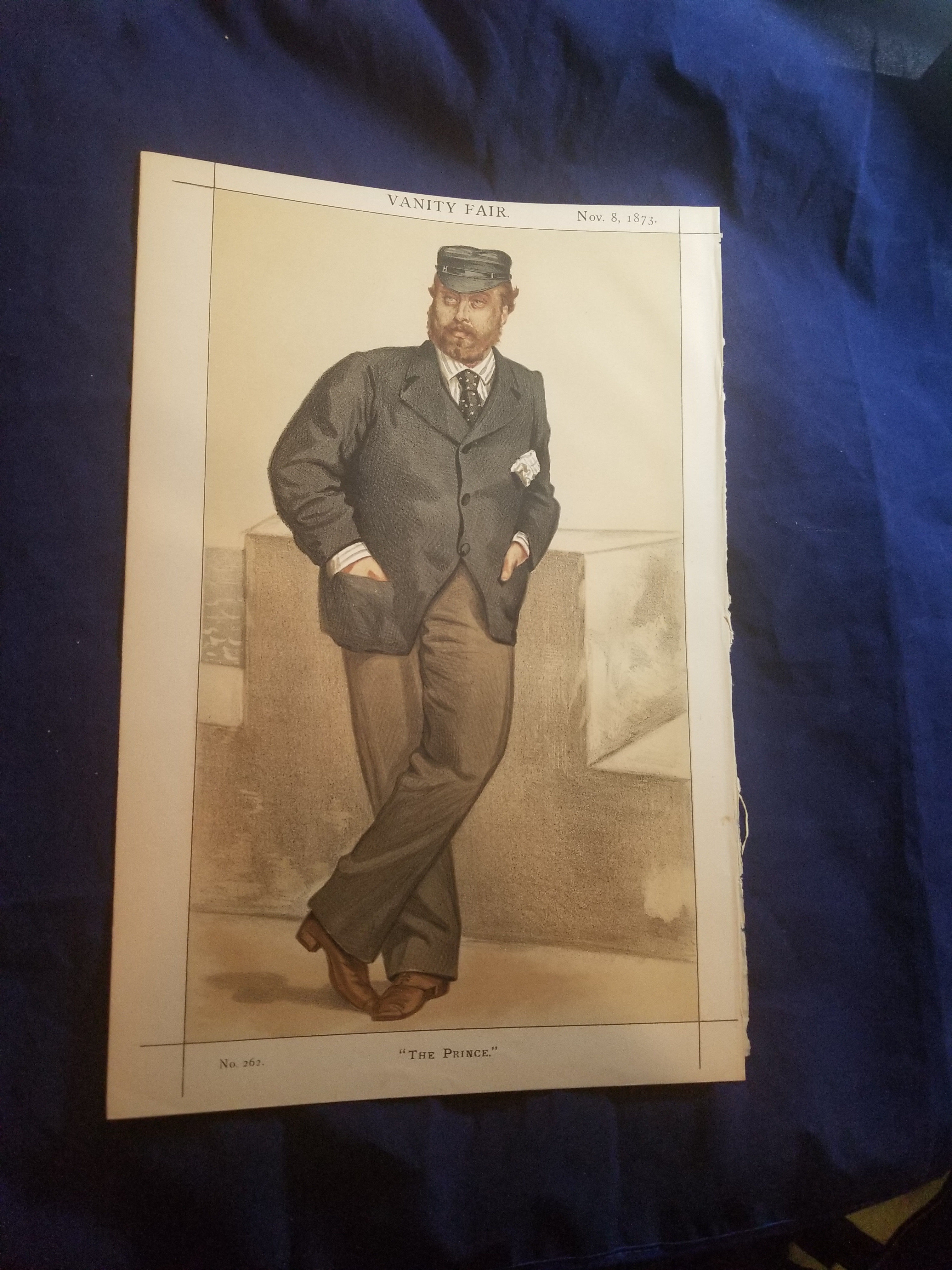 Small folio (13"x 9"), illustration, in color, No 262, Description page included. Normal aging and browning, top margin trimmed a bit, but not affecting image or text.; otherwise very good. Vanity Fair was founded by Thomas Gibson Bowles (AKA Jehu Junior) in 1868. The first issue appeared in 1869, and this magazine would continue through 1913. Bowles wrote much of the humorous and racy commentary in the early years. Despite presenting humorous caricatures of people, along with gossip about them, most people seemed to be flattered to be selected to be in Vanity Fair. This illustration is of Albert Edward, later to become Edward The VII (1841-1910). Edward was Queen Victoria's son and would become king in 1901 upon her death. The illustration shows a confident and robust Edward. DNB.
